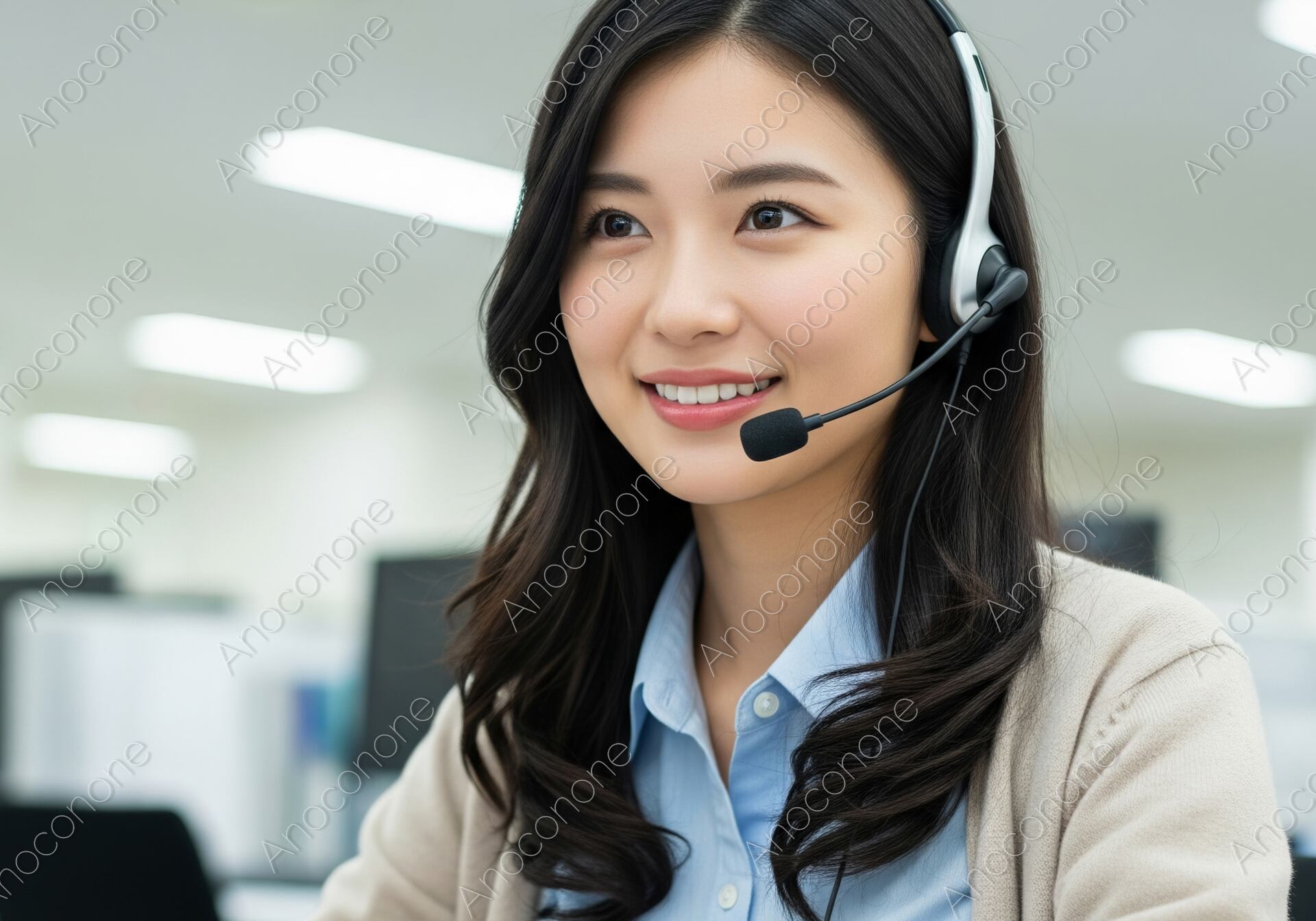 オフィスでパソコンとヘッドセットを使い、笑顔で仕事をする女性を捉えた一枚です。水色のシャツにベージュのカーディガンという、清潔感のあるオフィスカジュアルが魅力的です。お客様との電話対応やオンラインミーティングなど、幅広いビジネスシーンを表現します。ビジネス、オフィス、ライフスタイル、キャリアなど、幅広いテーマでご活用いただける高クオリティな素材です。