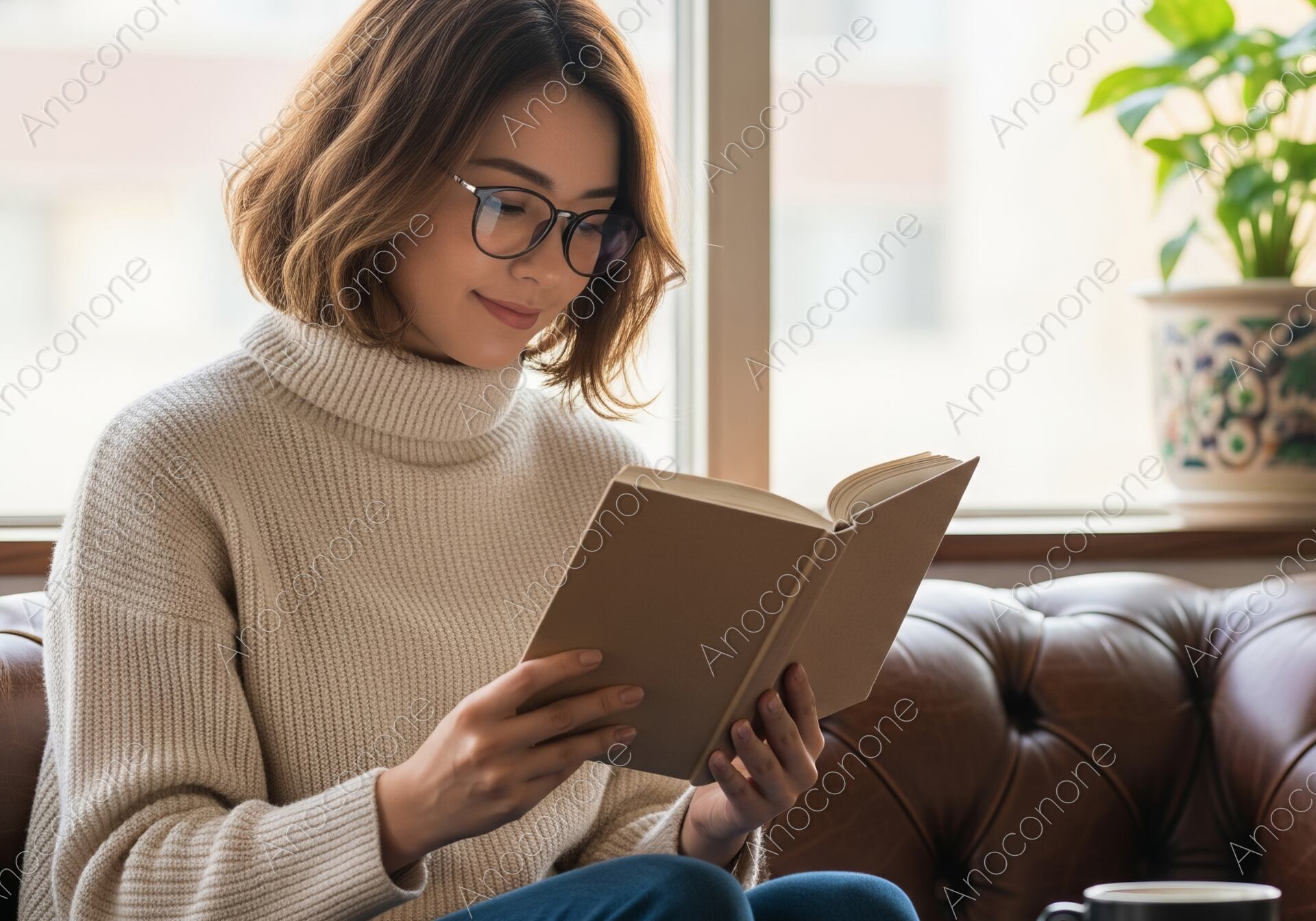温かい光が差し込む窓際で、白いタートルネックニットを着た女性が本を読んでいる一枚です。コーヒーカップが置かれたテーブルと、ヴィンテージ感のある革のソファが、落ち着いた大人の空間を演出します。眼鏡をかけ、真剣な表情で本を読む姿は、知的なライフスタイルを表現しています。読書、休日、カフェなど、幅広いテーマでご活用いただける高クオリティな素材です。