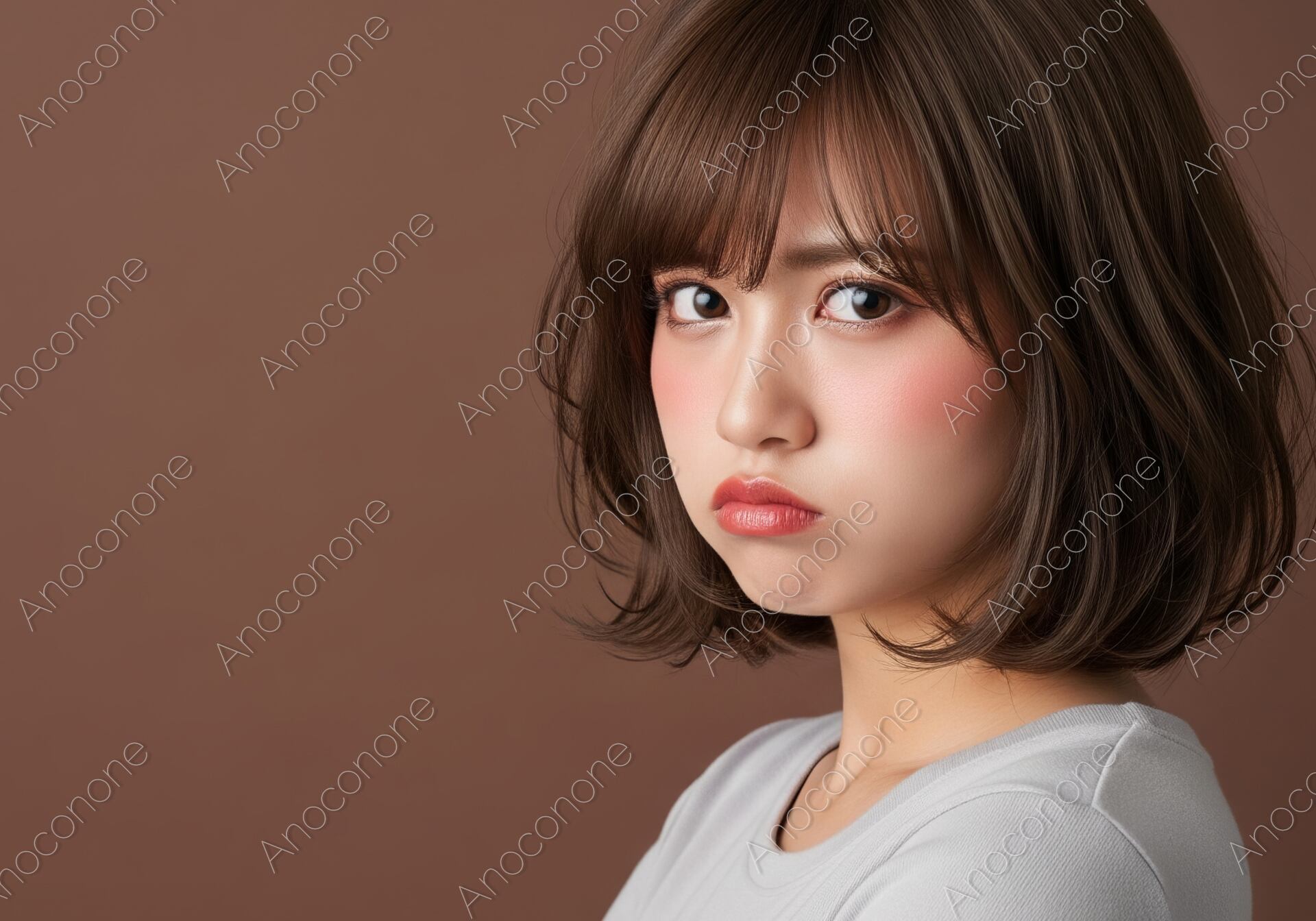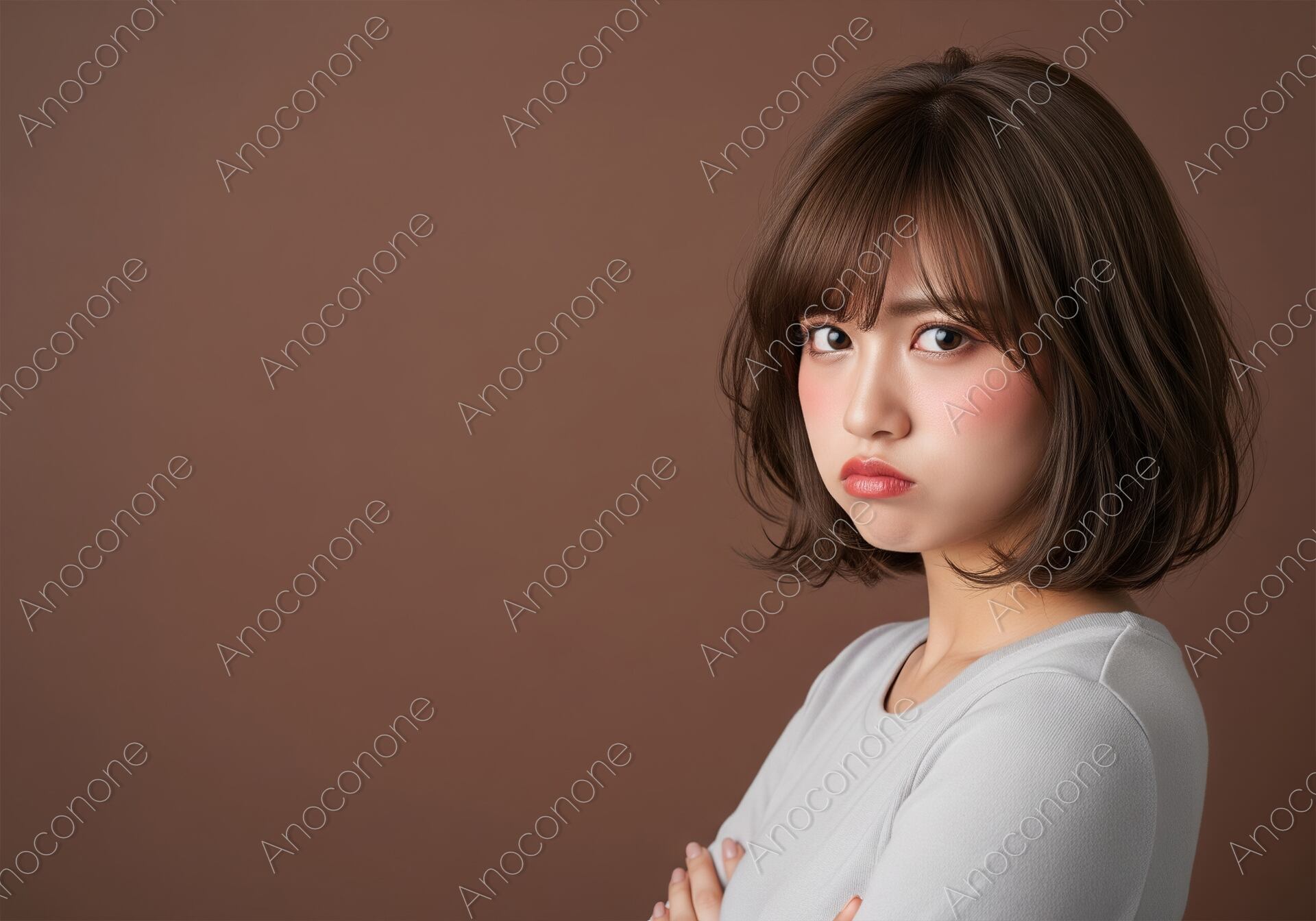 ブラウンの背景を背に、腕を組み、拗ねたような表情を見せる女性を捉えた一枚です。少し頬を膨らませ、不満げな表情が愛らしく、感情を豊かに表現しています。画面左側の広い余白は、テキストやロゴを配置するのに最適です。感情表現、ライフスタイル、美容、ヘアスタイルなど、幅広いテーマでご活用いただける高クオリティな素材です。