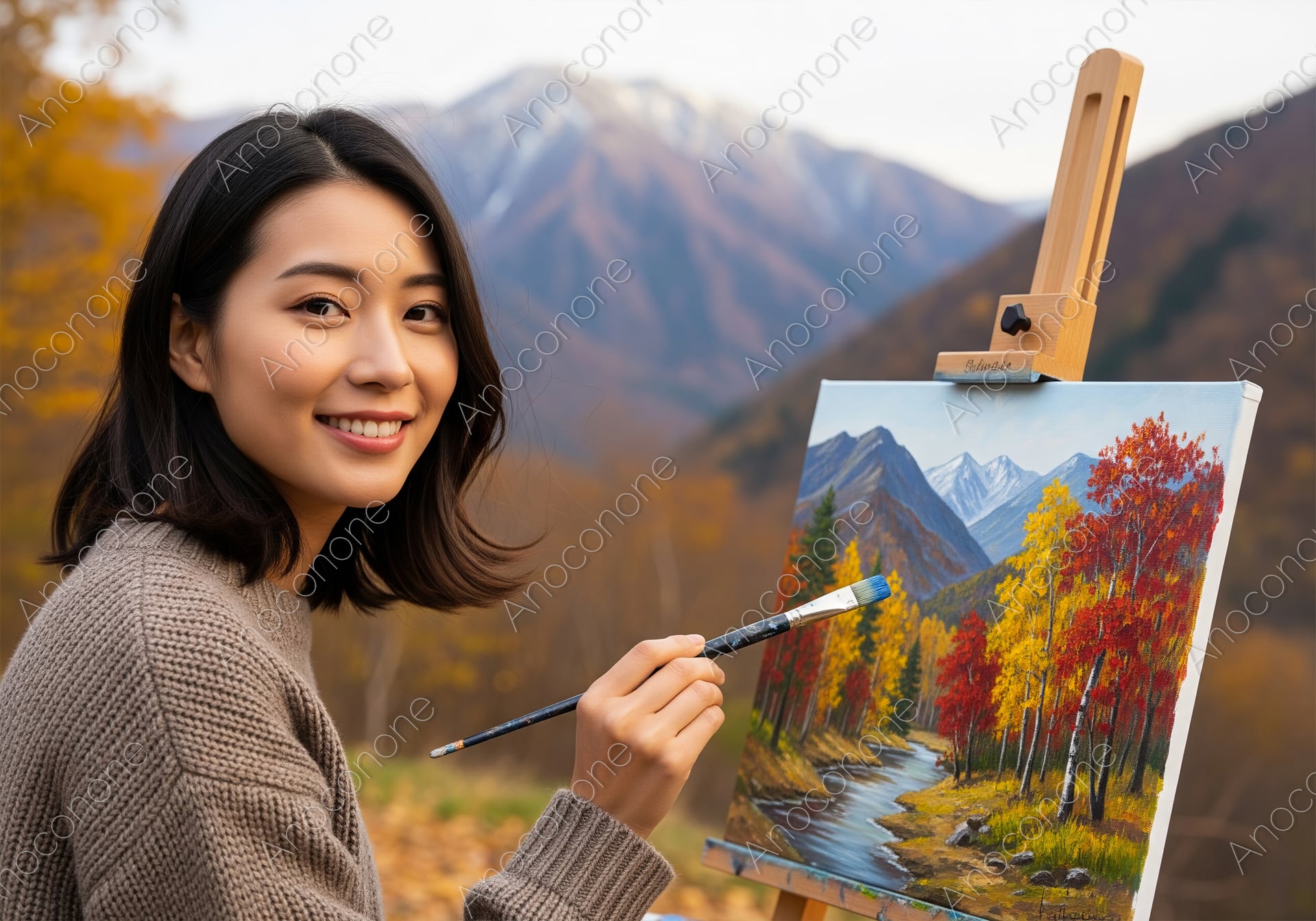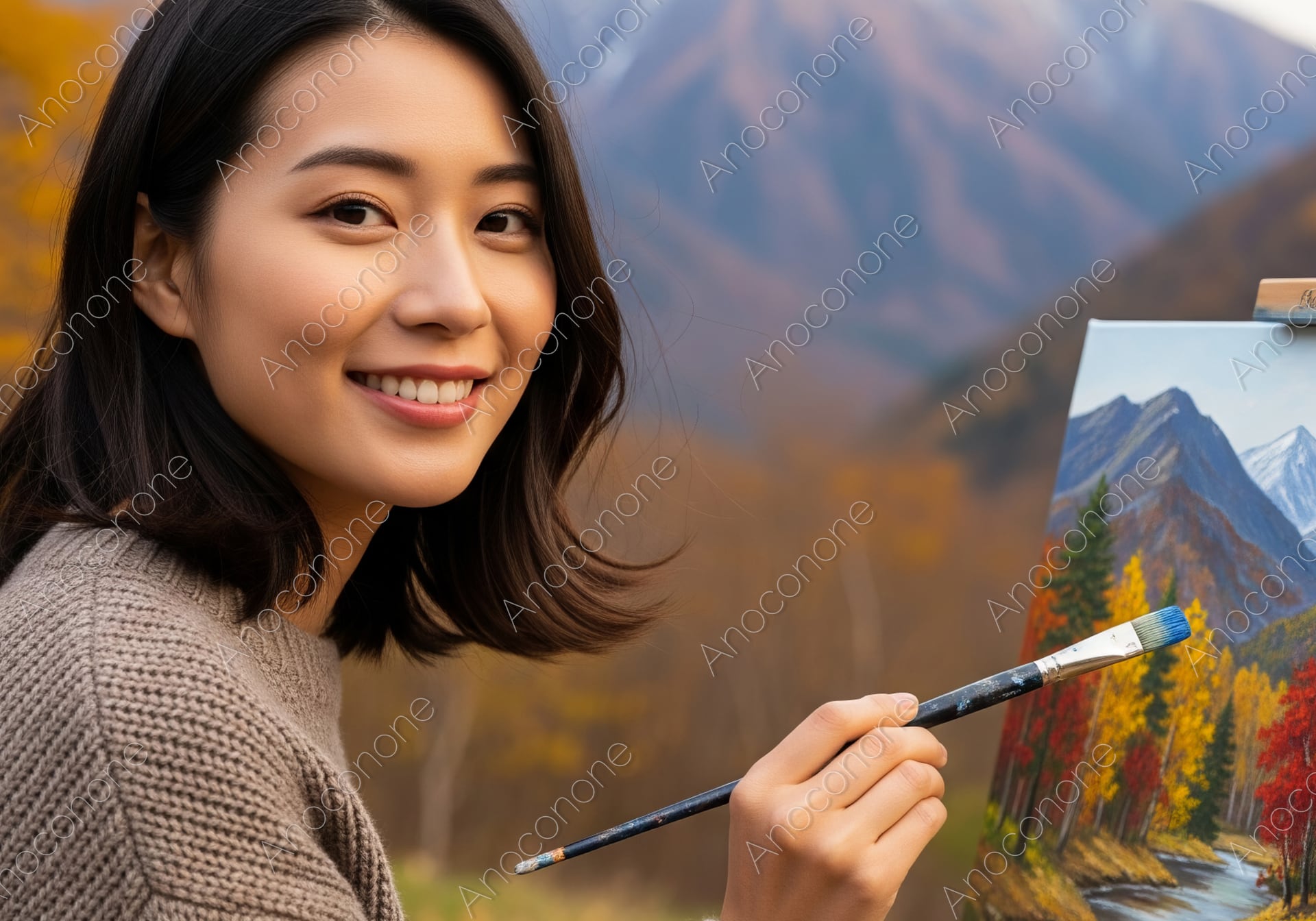 美しい紅葉の山を背景に、絵を描く女性を捉えた一枚です。茶色のニットに身を包み、絵筆を片手にカメラに向かって微笑む表情が魅力的です。壮大な自然の中で、趣味の絵画を楽しむ様子が、豊かで心安らぐ時間を表現しています。芸術、趣味、ライフスタイル、秋の風景など、幅広いテーマでご活用いただける高クオリティな素材です。