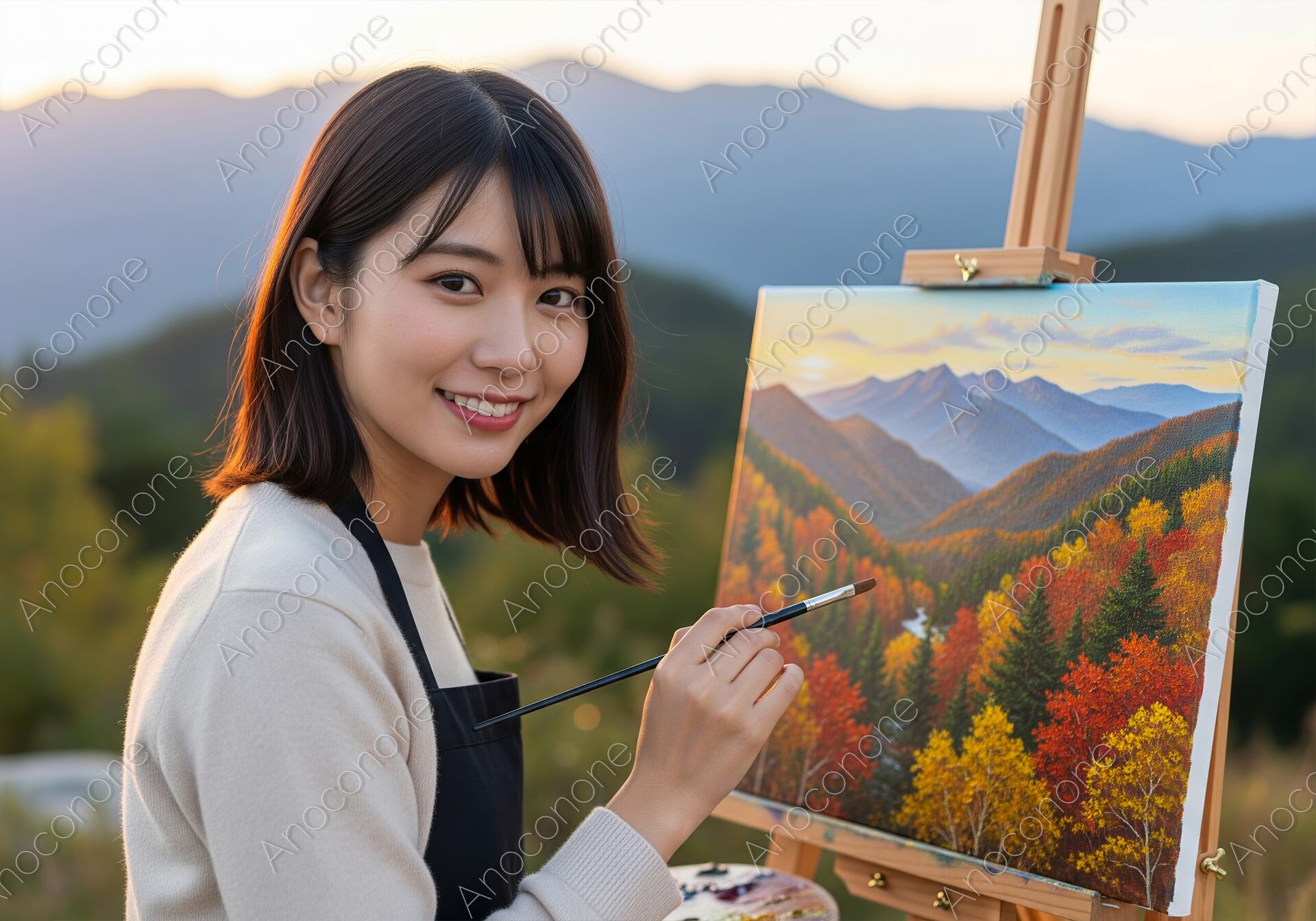 美しい紅葉の山々を背景に、絵を描く女性を捉えた一枚です。白いセーターとエプロンに身を包み、絵筆を片手にカメラに向かって微笑む表情が魅力的です。壮大な自然の中で、趣味の絵画を楽しむ様子が、豊かで心安らぐ時間を表現しています。芸術、趣味、ライフスタイル、秋の風景など、幅広いテーマでご活用いただける高クオリティな素材です。