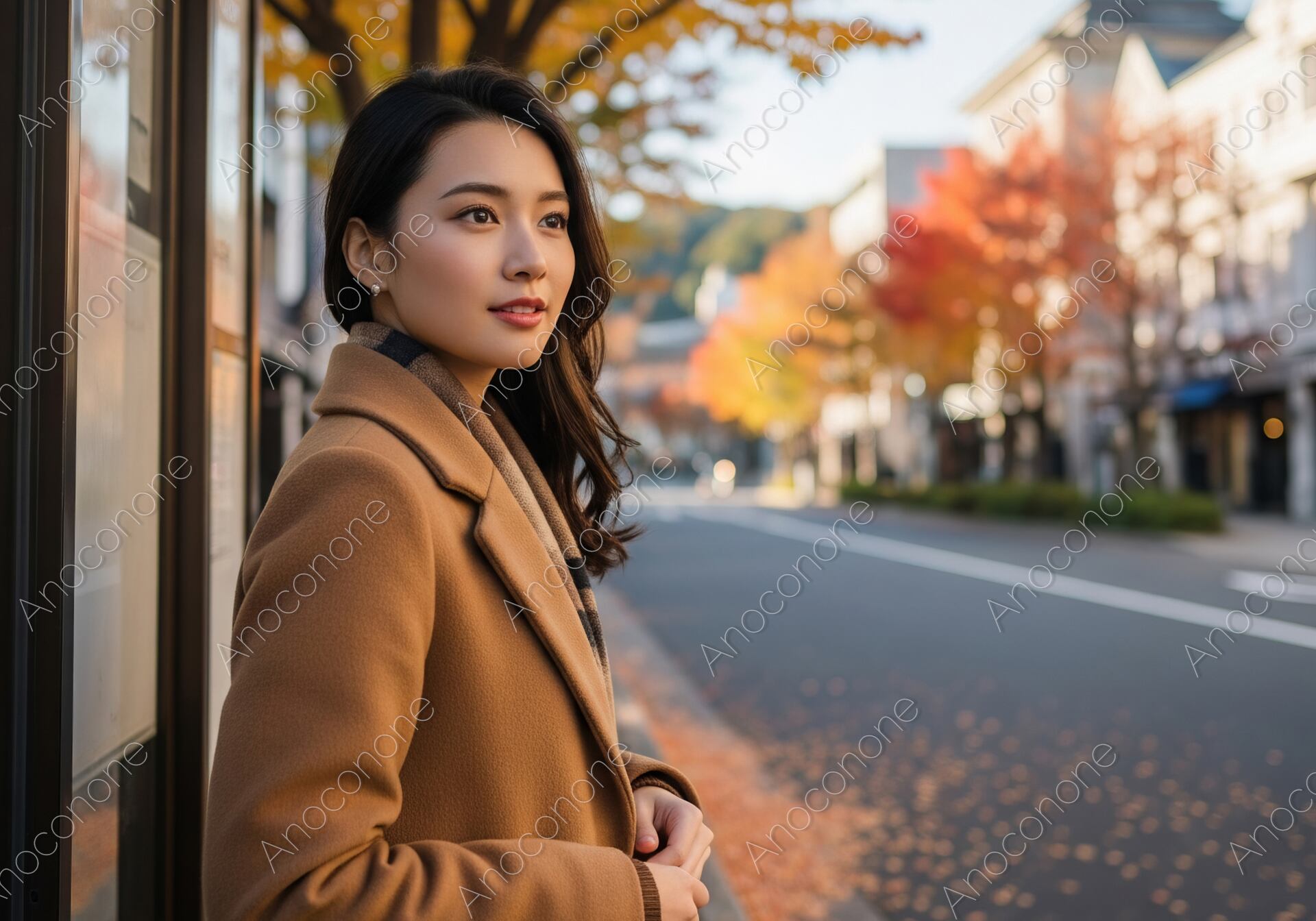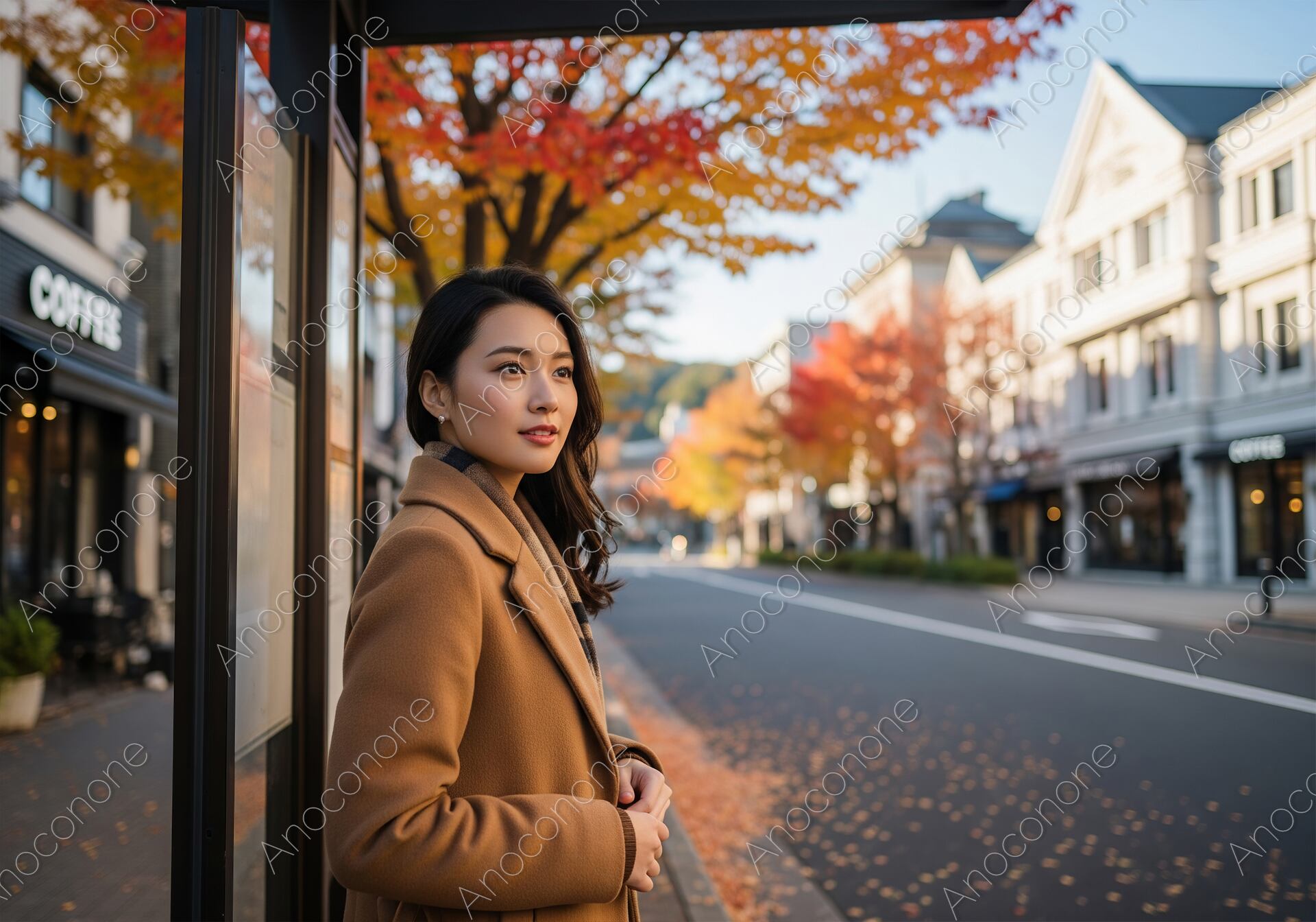 紅葉が美しい街のバス停で、バスを待つ女性を捉えた一枚です。茶色のコートを纏い、遠くを見つめる横顔が、知的で落ち着いた大人の雰囲気を演出しています。地面に舞い散る落ち葉が、秋の深まりを感じさせます。都会的ながらも穏やかな時間と、秋のファッションを豊かに表現しています。ファッション、ライフスタイル、休日、お出かけなど、幅広いテーマでご活用いただけます。