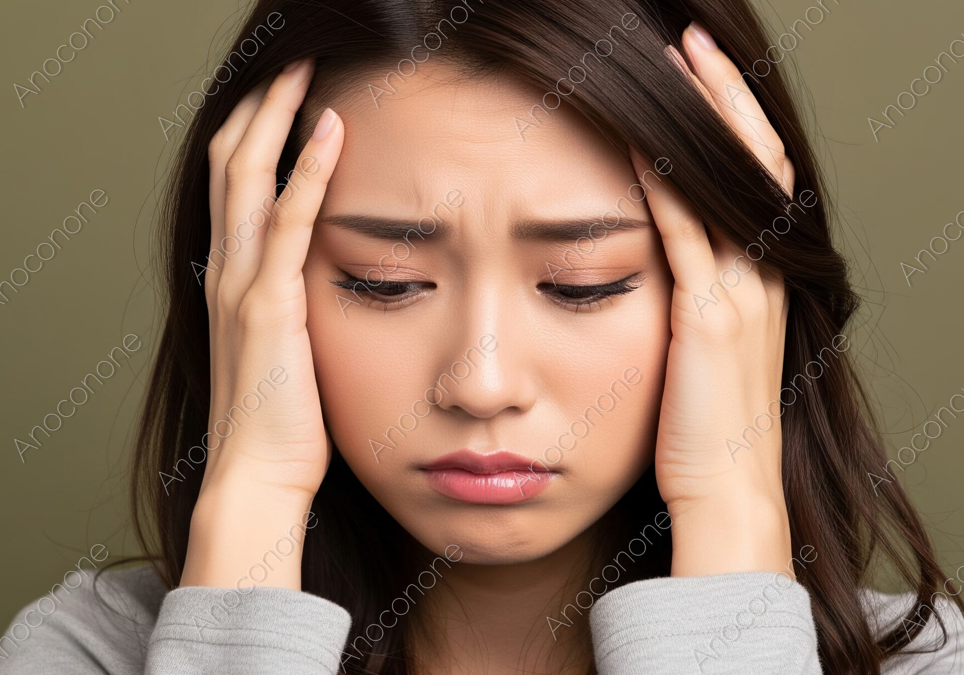両手で頭を抱え、困惑した表情を見せる女性を捉えた一枚です。少し眉間にしわを寄せ、視線を下ろした姿が、悩みや心配といった感情を豊かに表現しています。シンプルな背景とモデルの豊かな表情が際立ち、見る人に強いインパクトを与えます。感情、発見、感動、インスピレーションなど、幅広いテーマでご活用いただける高クオリティな素材です。