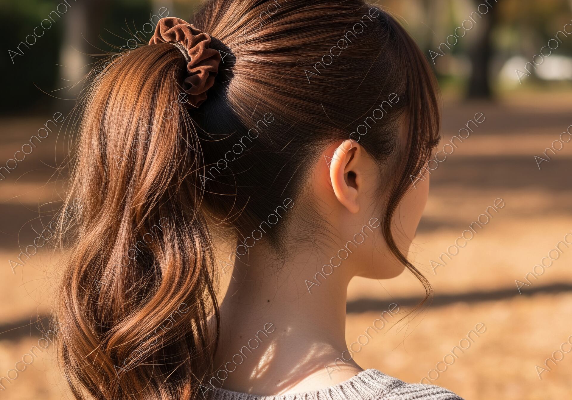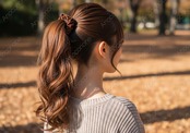 落ち葉が絨毯のように敷き詰められた公園で、後ろ姿の女性を捉えた一枚です。毛先を巻いてルーズにまとめたポニーテールと、グレーのニットが温かく柔らかい雰囲気を演出しています。秋の深まりを感じさせる景色と、女性の佇まいが、心安らぐ時間を豊かに表現します。ヘアスタイル、秋の情景、休日、ライフスタイルなど、幅広いテーマでご活用いただけます。