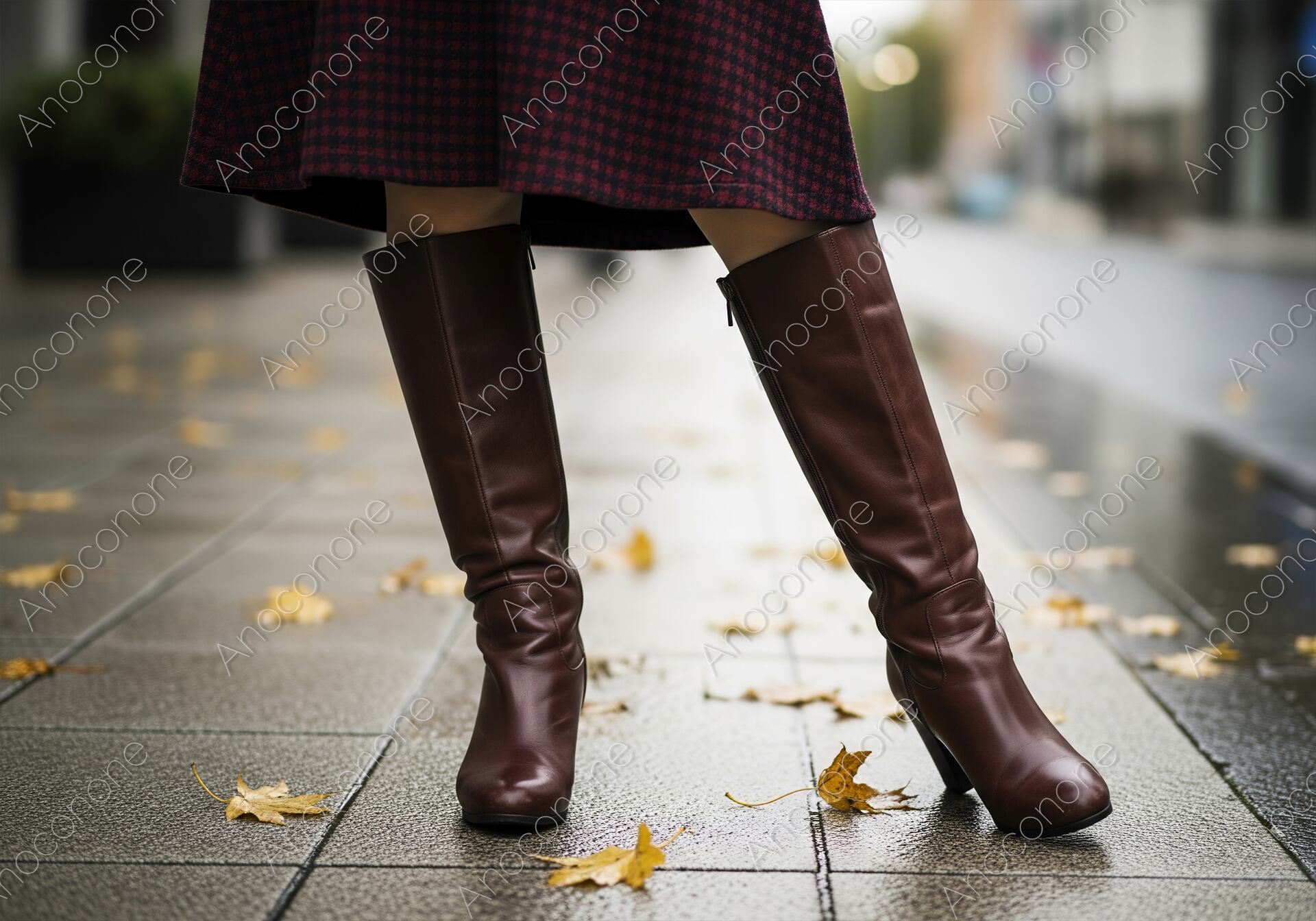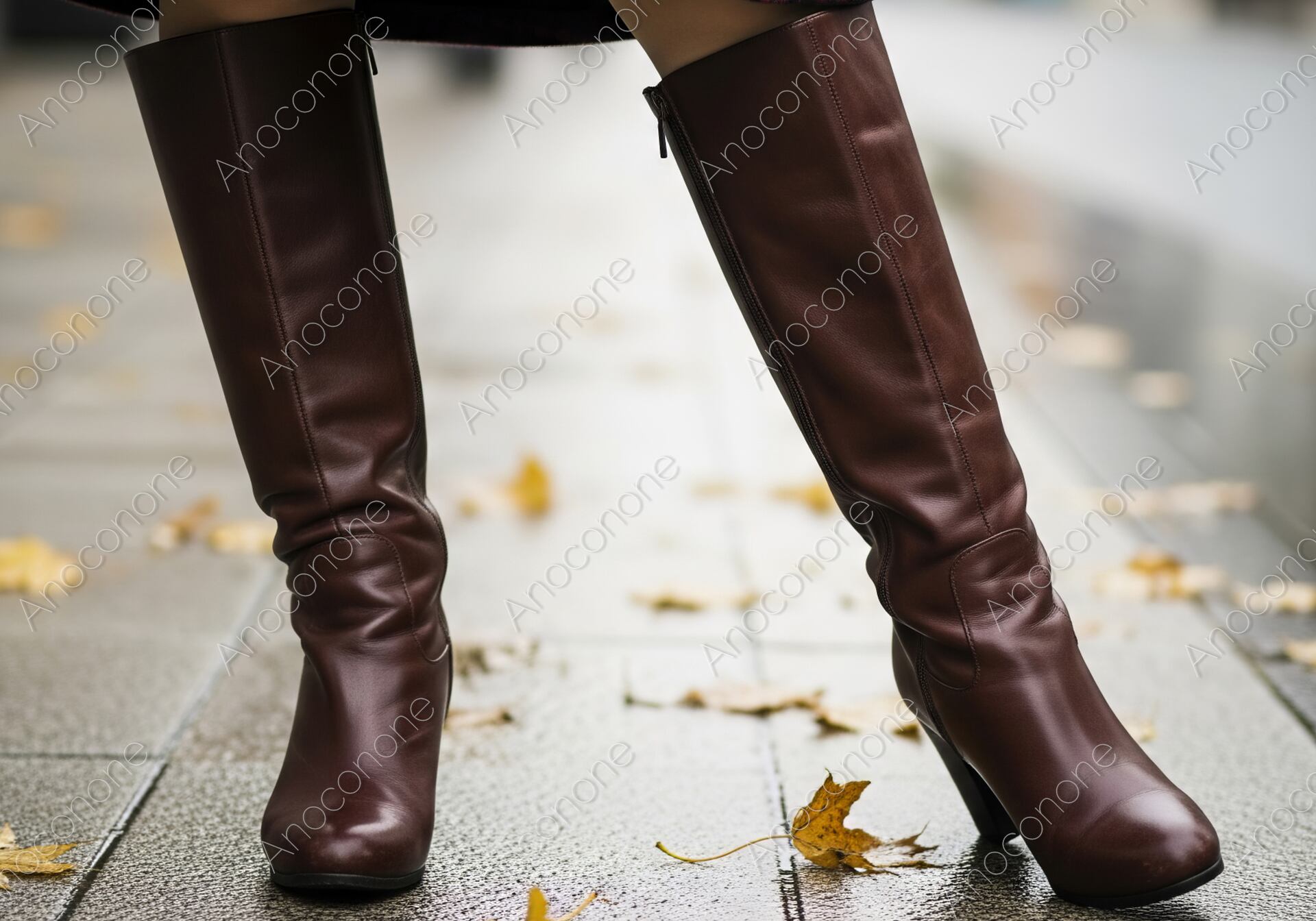 雨上がりの秋の街並みで、茶色のロングブーツを履いて歩く女性を捉えた一枚です。濡れた地面に散らばる落ち葉が、秋の深まりを感じさせ、温かい雰囲気を演出します。落ち着いた色のブーツと、しっとりとした街の情景がエレガントで、大人の女性の秋の装いを豊かに表現しています。ファッション、ライフスタイル、秋の情景など、幅広いテーマでご活用いただける高クオリティな素材です。