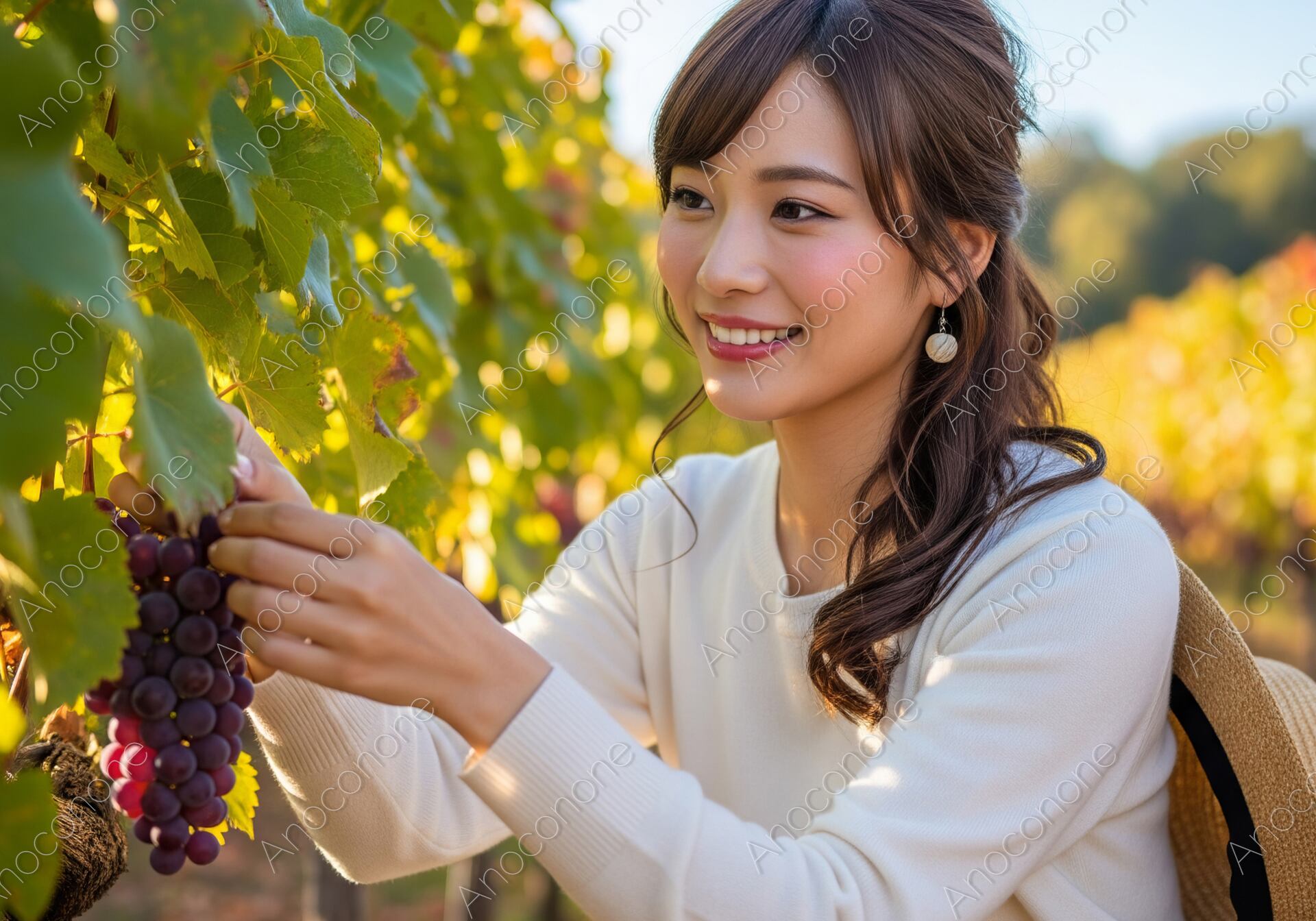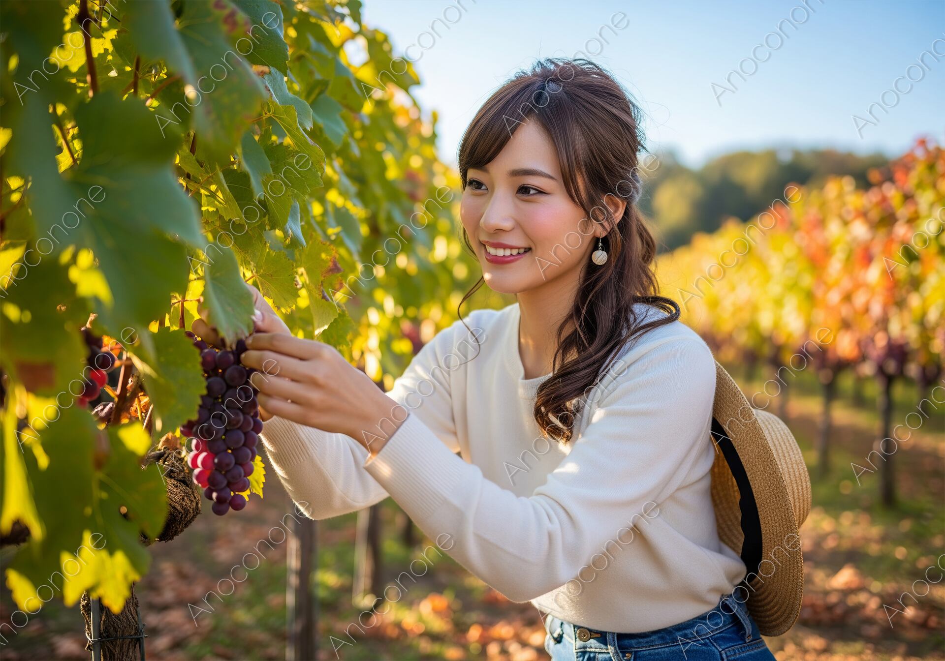 たわわに実ったぶどう棚の下で、ぶどう狩りを楽しむ女性を捉えた一枚です。白いニットにデニムというカジュアルな服装が、秋の行楽にぴったりです。太陽の光を浴びながら、優しい笑顔でぶどうを摘む様子が、収穫の喜びと豊かな時間を表現しています。秋、食、旅行、ライフスタイルなど、幅広いテーマでご活用いただける高クオリティな素材です。