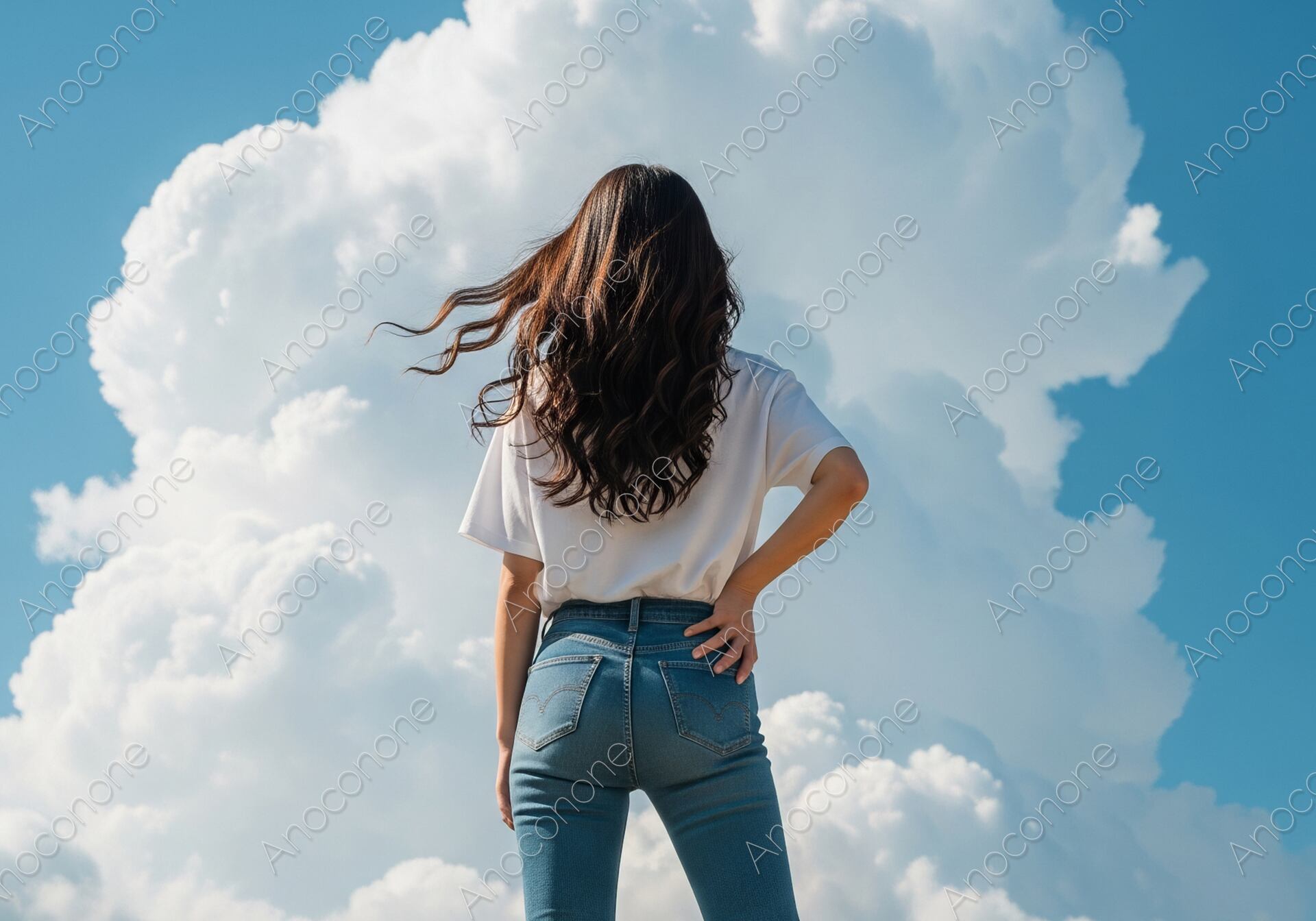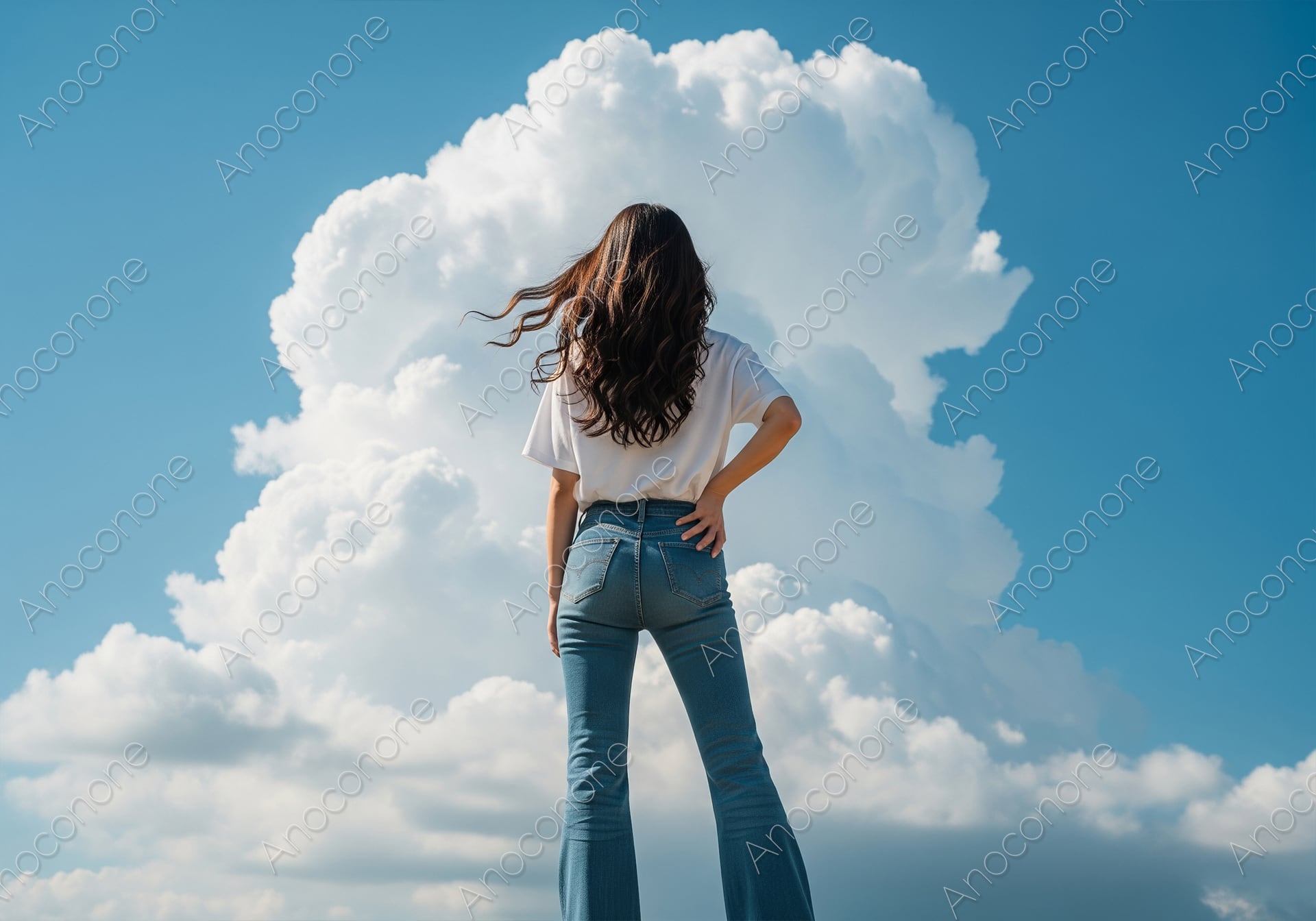 夏の青空を背景に、白いTシャツとフレアデニムを合わせた女性の後ろ姿を捉えた一枚です。風に揺れる髪と、空を静かに見上げる姿が、旅先や休日の情景を豊かに表現しています。入道雲の壮大さと女性の組み合わせが、心安らぐ時間と旅情を演出します。夏、旅、お出かけなど、幅広いテーマでご活用いただける高クオリティな素材です。
