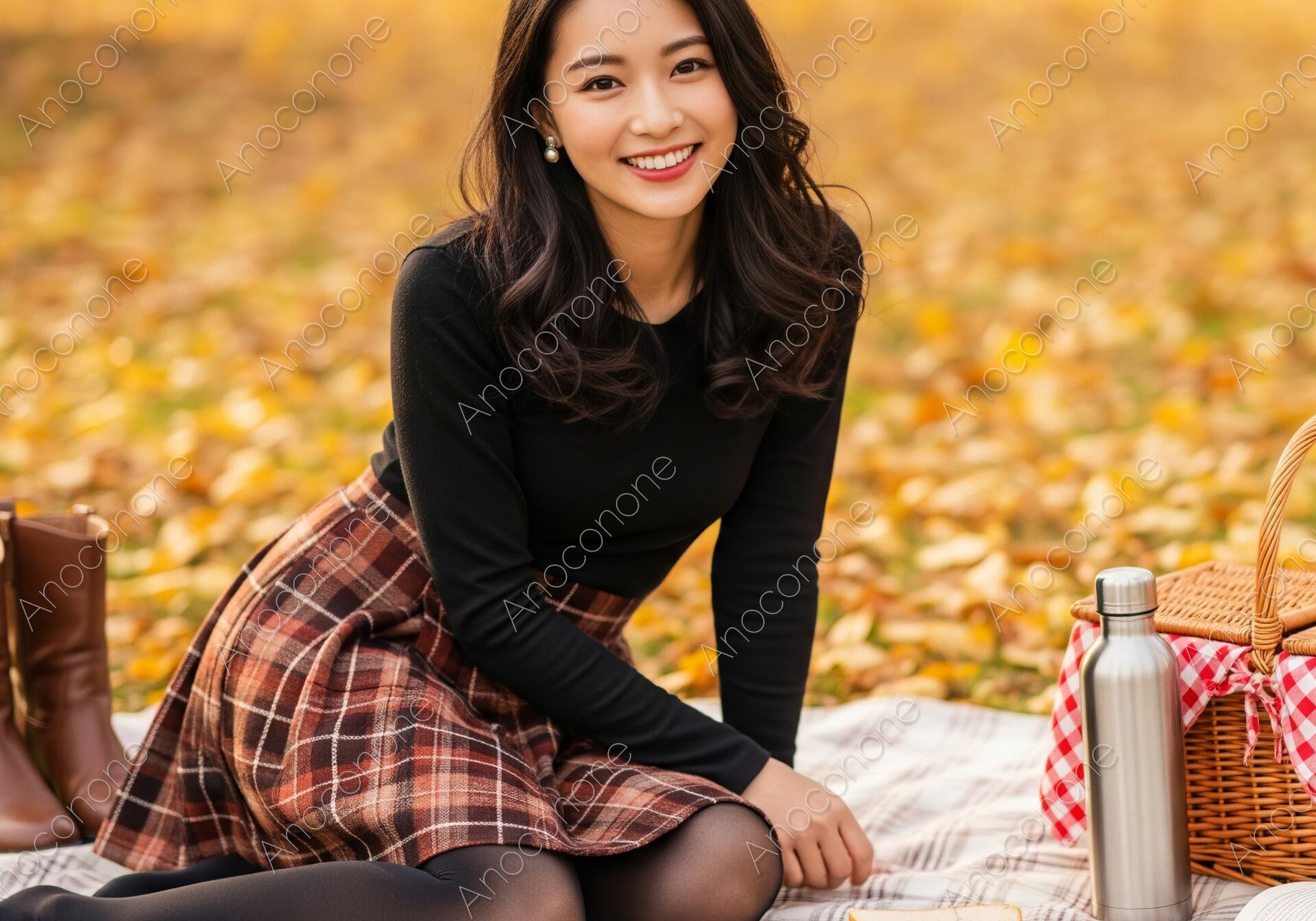 落ち葉が舞い散る秋の公園で、ピクニックを楽しむ女性を捉えた一枚です。黒いリブニットにチェック柄のスカート、黒いタイツという秋らしいコーディネートが魅力的です。シートに座り、カメラに向かって微笑む姿が、心安らぐ時間と幸福感を表現します。秋の休日、ファッション、ライフスタイルなど、幅広いテーマでご活用いただける高クオリティな素材です。