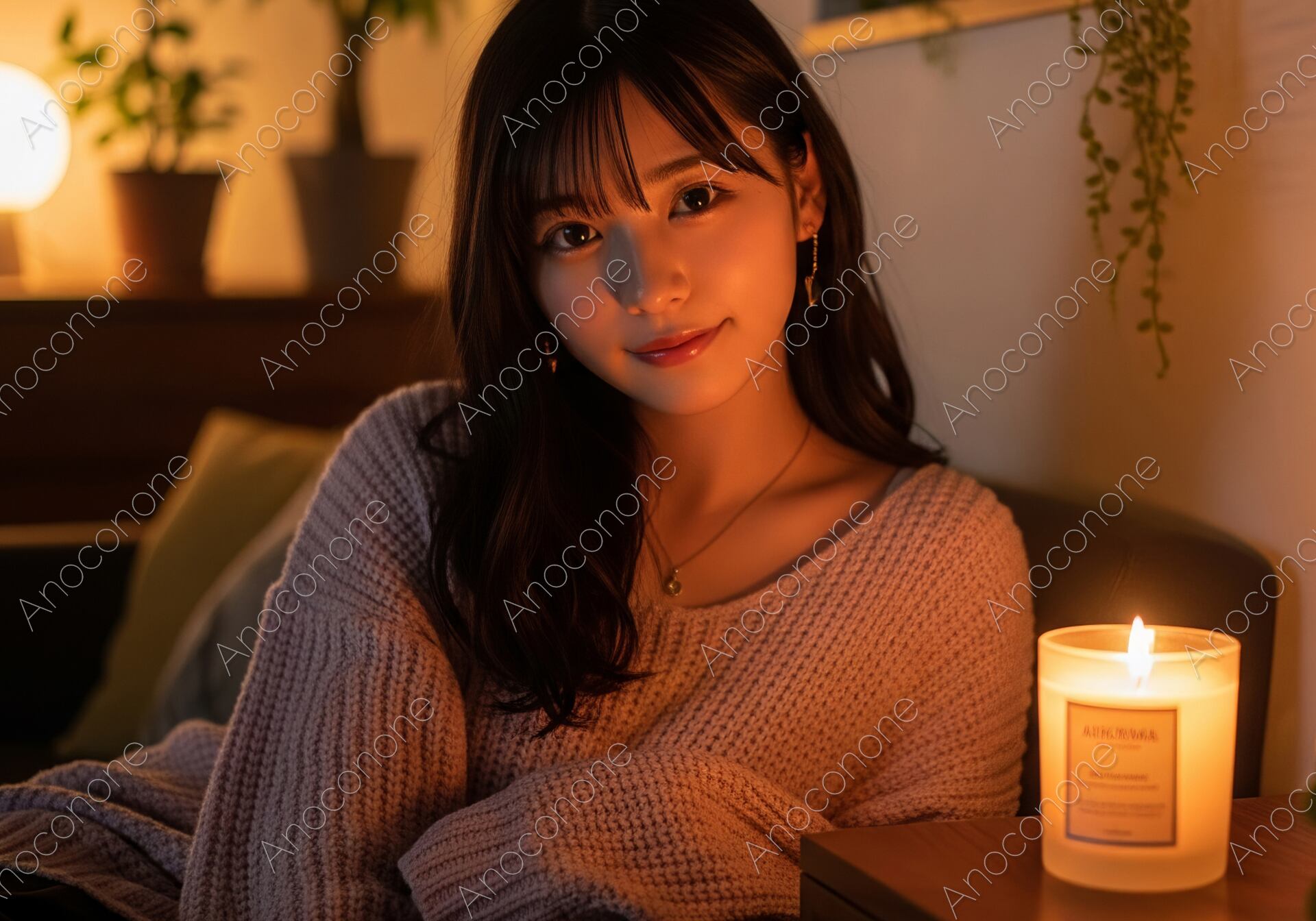 温かい光に包まれた部屋で、アロマキャンドルを眺める女性を捉えた一枚です。ピンクのニットに身を包み、優しい笑顔をカメラに向けています。キャンドルの炎と柔らかな照明が、心安らぐ時間を豊かに表現しており、落ち着いた大人の雰囲気を演出します。アロマ、癒やし、ライフスタイル、美容など、幅広いテーマでご活用いただける高クオリティな素材です。