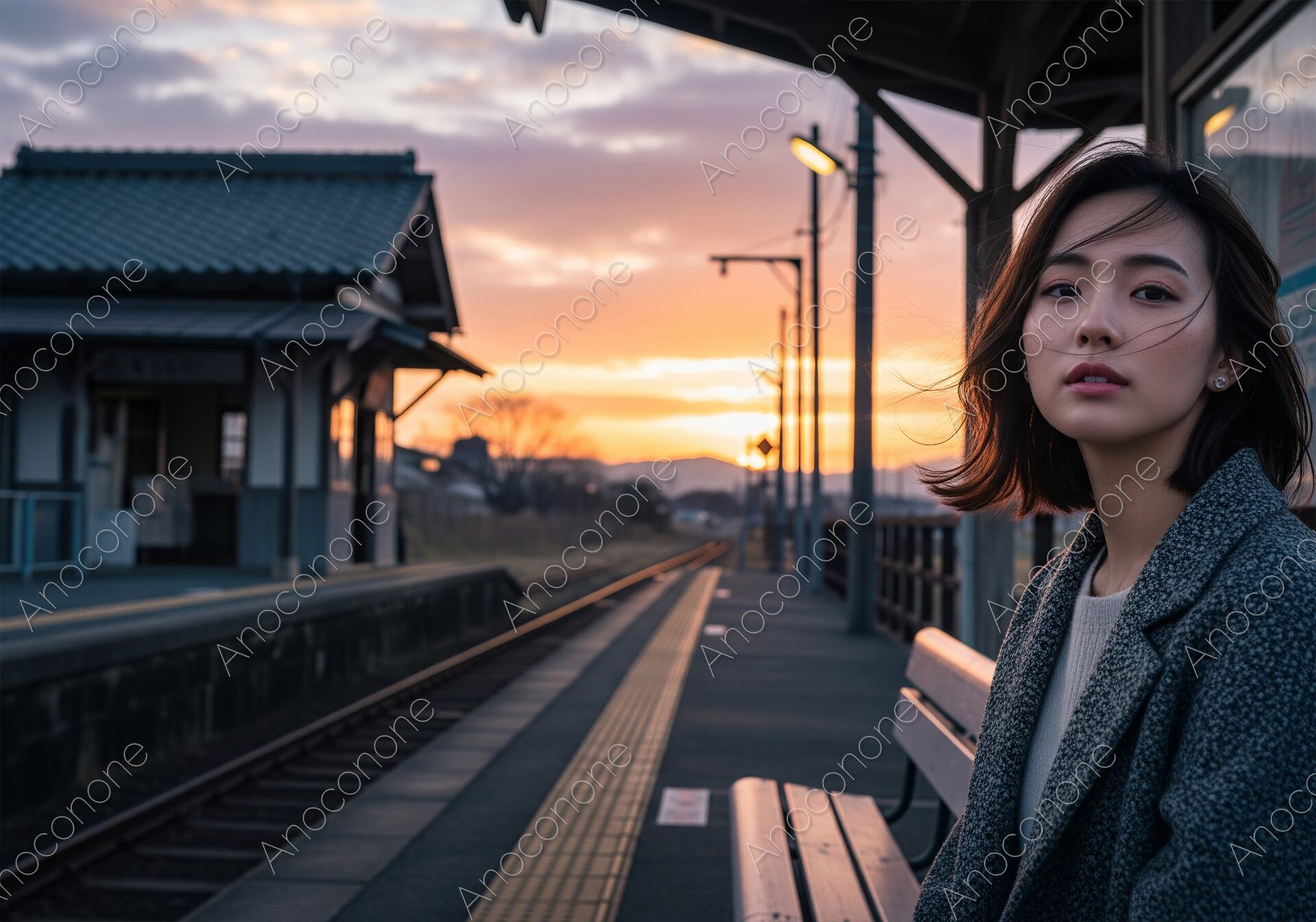 夕焼けに染まる駅のホームで、物思いにふける表情の女性のポートレートです。グレーのツイードコートをまとい、風になびくショートヘアが、旅の途中のような叙情的な雰囲気を醸し出しています。旅や帰省、切ない感情を表現したいコンテンツに最適で、ファッションやライフスタイル関連の広告やSNSに深みのあるイメージを提供します。