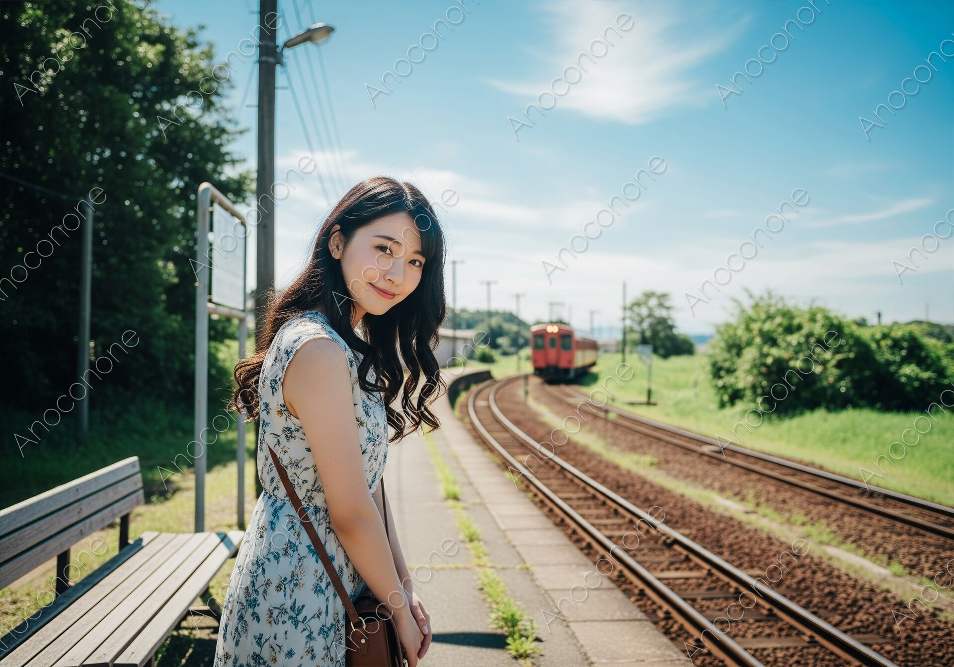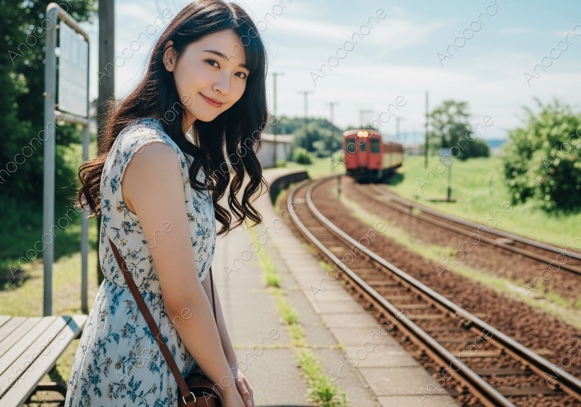 穏やかな夏の午後、田舎の小さな駅のホームで、花柄のノースリーブワンピースをまとった女性がこちらに微笑みかけているポートレートです。風になびく美しいロングヘアと、背景を走るレトロな電車が、ノスタルジックな旅の雰囲気を醸し出しています。旅行や休日の過ごし方、ライフスタイル、ファッション関連のコンテンツに最適な、明るく心温まる一枚です。
