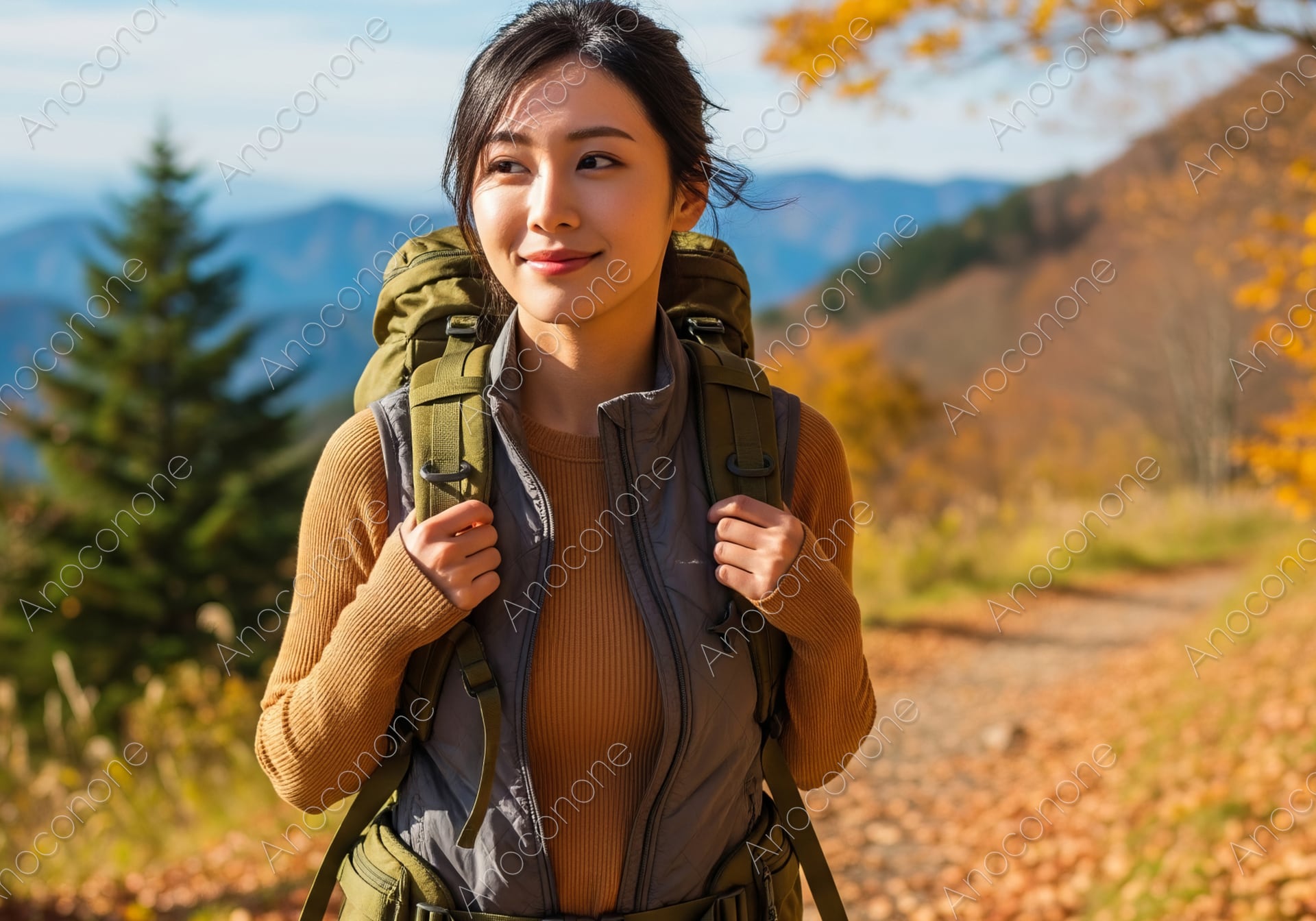 紅葉が美しい山道をリュックとベストを身につけて歩く女性のポートレートです。上を見上げて微笑む表情からは、自然の中で過ごすことの喜びと、心安らぐ雰囲気が伝わってきます。秋の行楽、旅行、アウトドア、ハイキング、ライフスタイル関連の広告やコンテンツに、見る人の心を温める魅力的な一枚としてご活用いただけます。