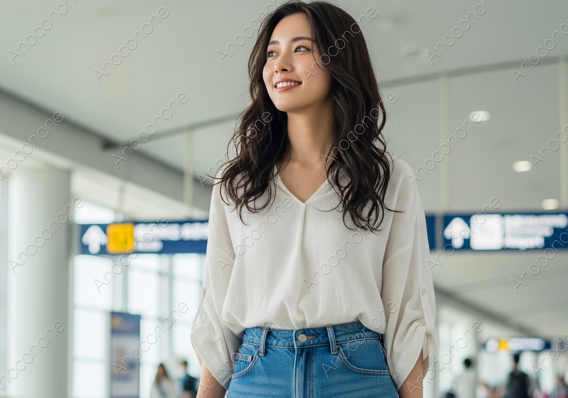 空港の明るい通路を、笑顔でスーツケースを引いて歩く女性のポートレートです。白いブラウスにデニムのショートパンツという軽やかなスタイルと、手に持った麦わら帽子が、バカンスへの期待感を高めます。旅行の出発、ライフスタイル、ファッション関連の広告やコンテンツに最適な、明るく心躍る一枚です。