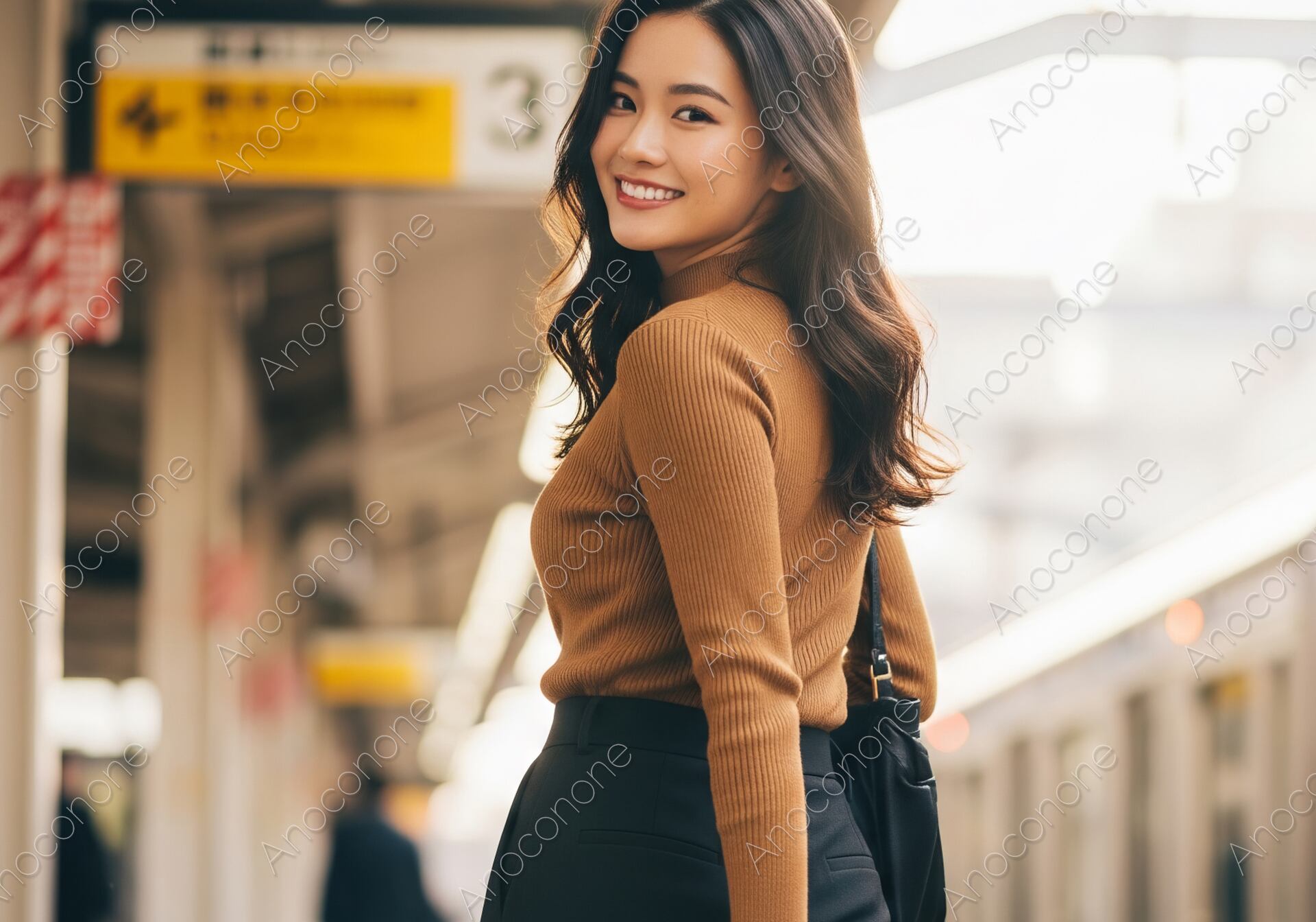 駅のホームで、タートルネックのブラウンのトップスと黒いスカートを合わせた女性が、カメラに微笑みながら振り返るポートレートです。風になびくゆるいウェーブヘアと、手に持ったスーツケースが、旅の活気と楽しさを伝えています。ファッション、旅行、ライフスタイル、休日の過ごし方に関するコンテンツに最適な、明るく洗練された一枚です。