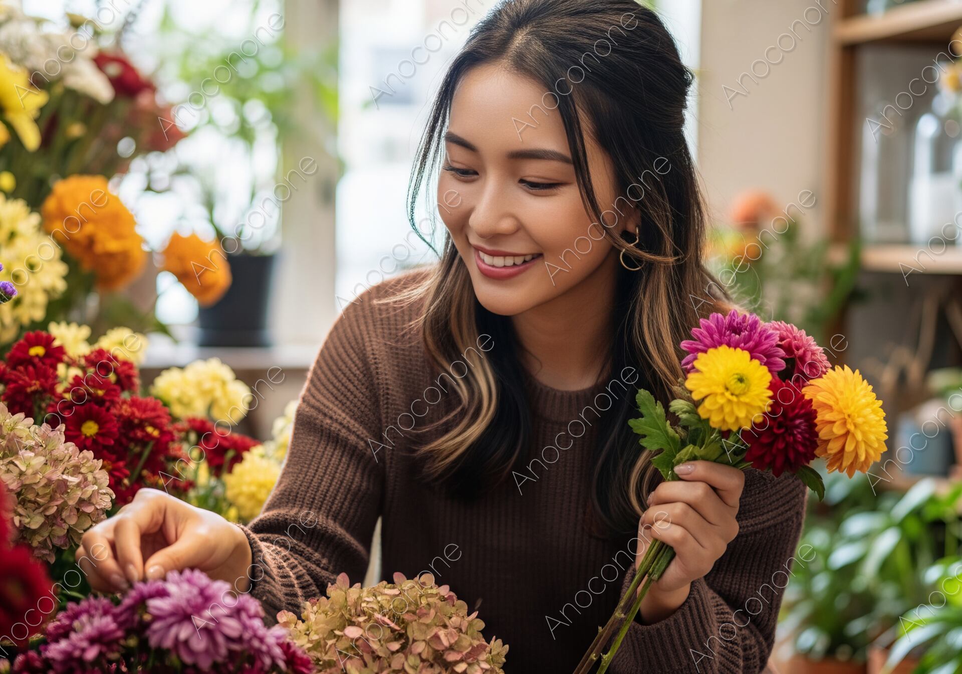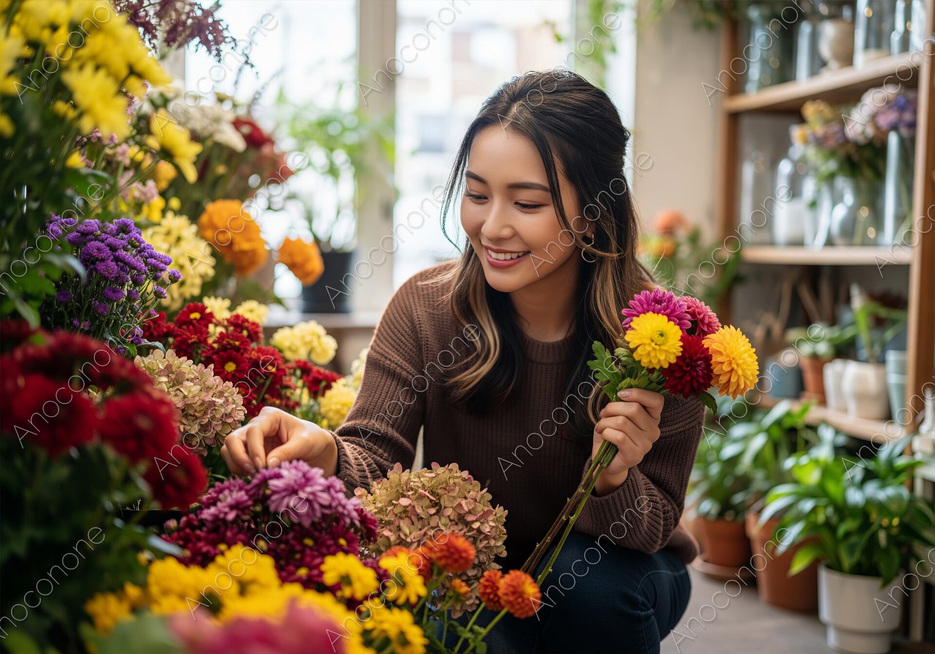 温かみのあるブラウンのセーターをまとい、花屋で笑顔で花を選ぶ女性のポートレートです。ハーフアップにしたヘアスタイルと、優しい表情が、花を選ぶ楽しいひとときを演出しています。花束を手に、色とりどりの花に囲まれる姿は、ライフスタイル、フラワーアレンジメント、趣味関連のコンテンツに最適な、穏やかで魅力的な一枚です。