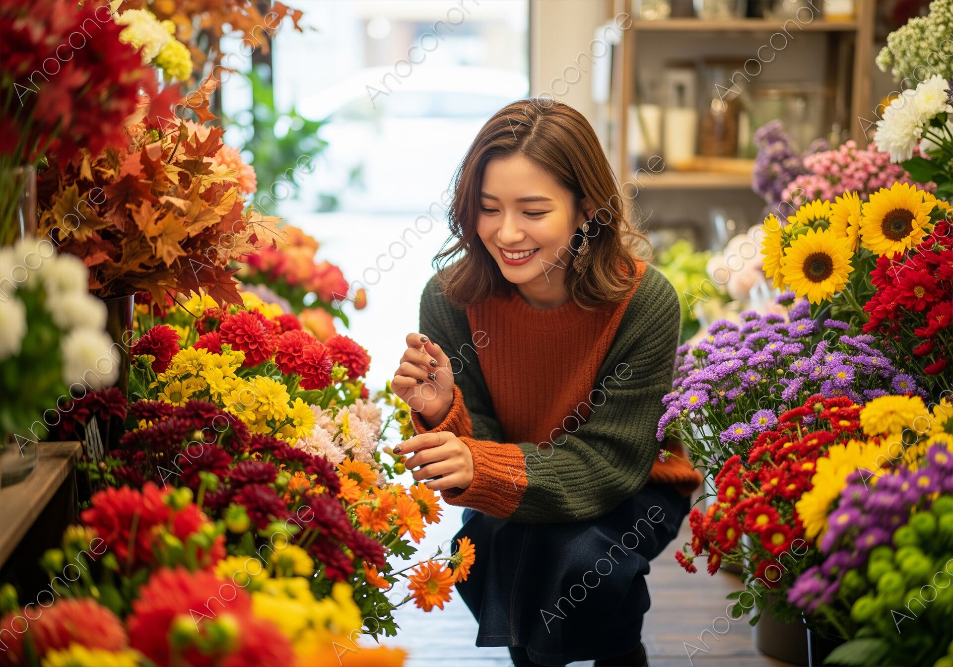 色とりどりの花が並ぶ花屋で、楽しそうにしゃがみこんで花を選ぶ女性のポートレートです。オレンジとグリーンのツートーンのセーターと、優しい笑顔が、心温まる柔らかな雰囲気を演出しています。花を愛でる穏やかなひとときは、ライフスタイル、フラワーアレンジメント、趣味、秋のイベント関連のコンテンツに最適です。