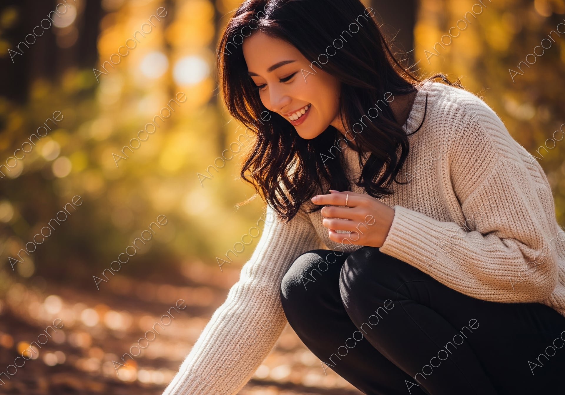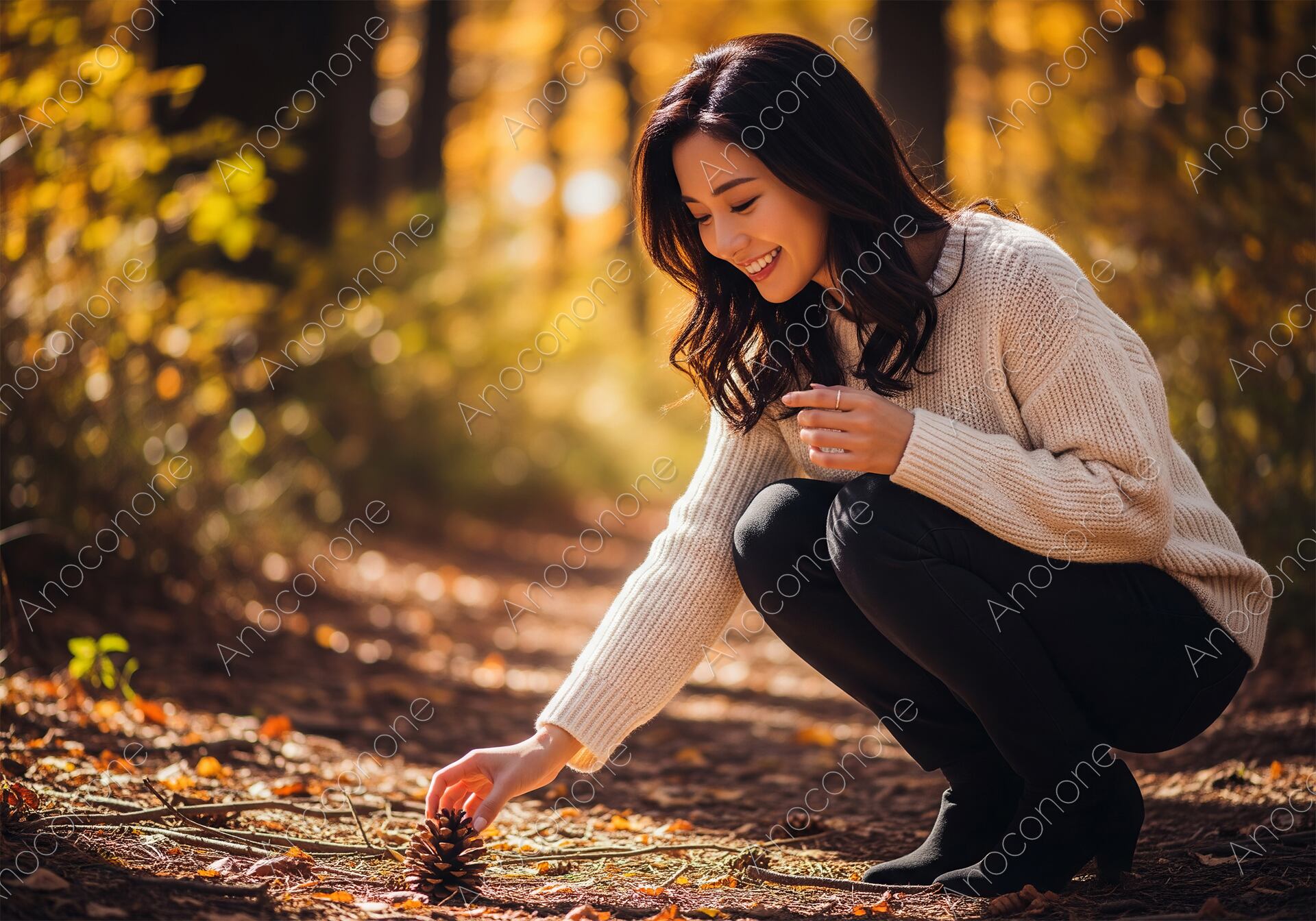 紅葉の落ち葉が敷き詰められた森の小道で、しゃがみこんで松ぼっくりを拾う女性のポートレートです。白いニットに黒いパンツ、足元のショートブーツが、秋らしいカジュアルで温かみのあるスタイルを演出しています。自然の中での心地よいひとときや、穏やかな休日の過ごし方を表現したい、ライフスタイル、ファッション関連のコンテンツに最適な一枚です。