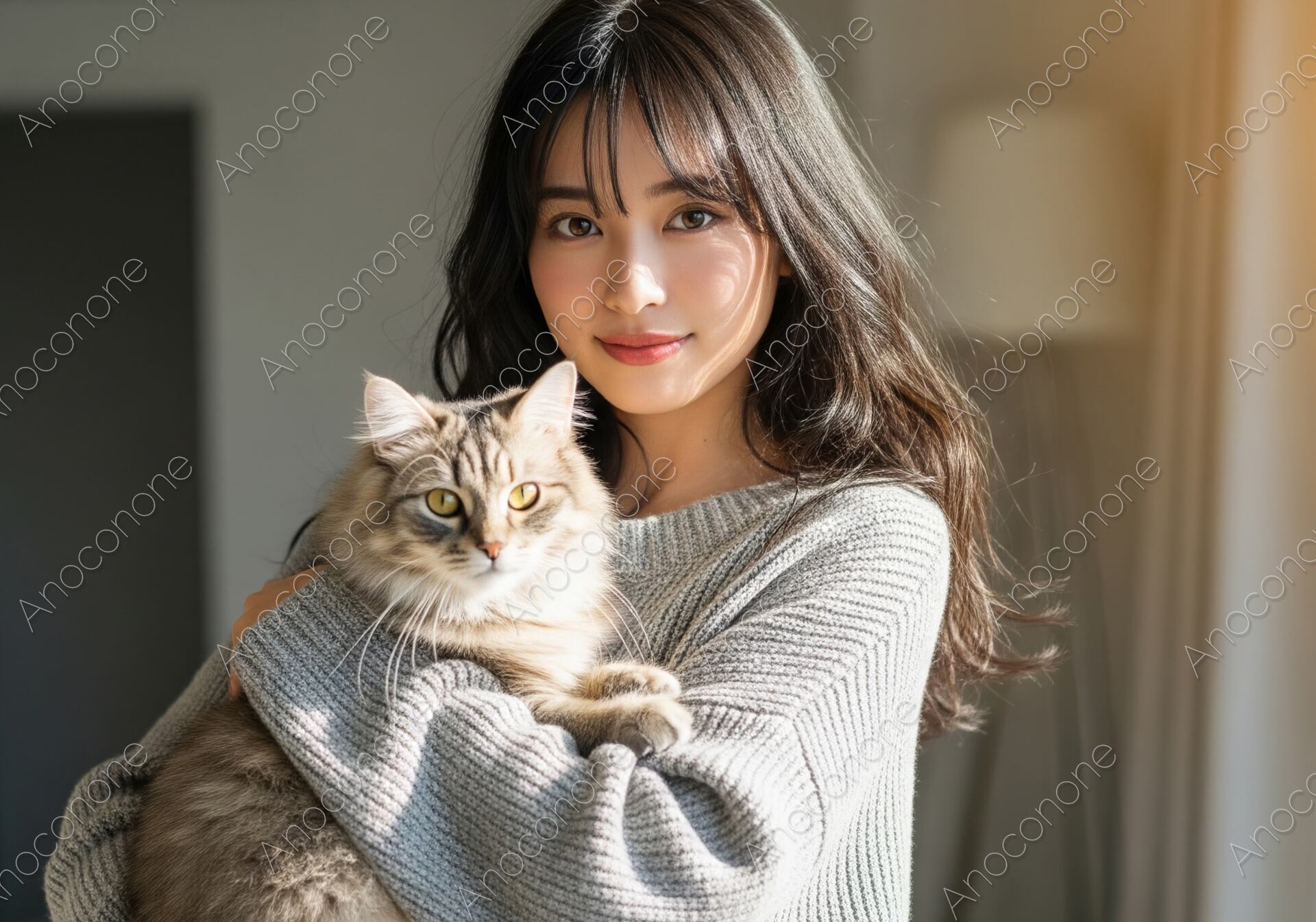 窓から温かい陽射しが差し込む部屋で、グレーのニットを着用した女性が、猫を優しく抱っこしているポートレートです。前髪ありのロングヘアと、穏やかな眼差しが、ペットとの心安らぐ、幸せでリラックスした日常を伝えています。動物愛護、ペット関連商品、ライフスタイル、癒しをテーマにしたコンテンツに最適な一枚です。
