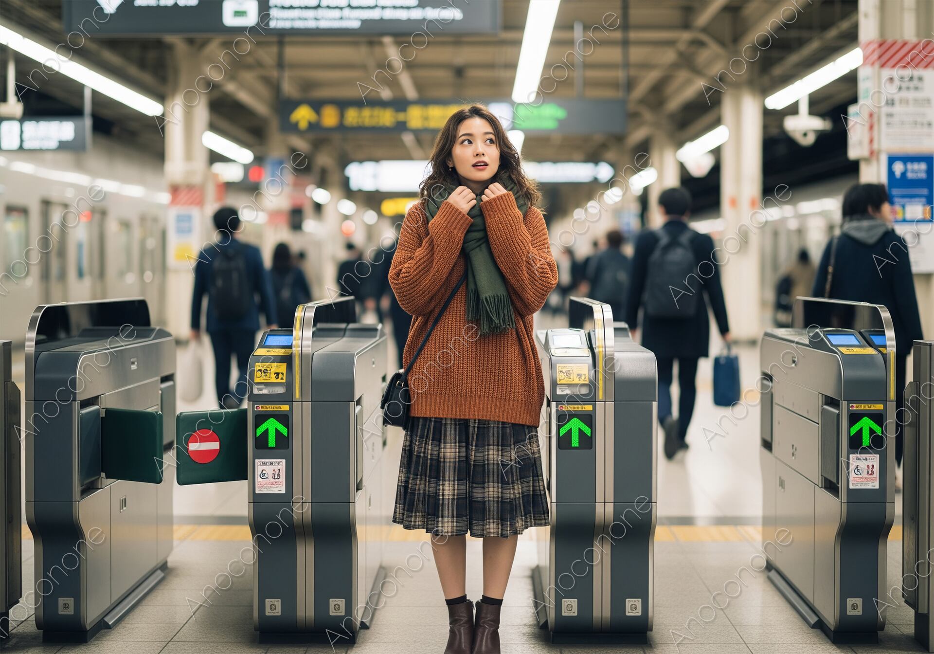 暖かみのあるテラコッタカラーのざっくりニットに、落ち着いたグリーンのマフラーとクラシカルなタータンチェックのミモレ丈スカートを合わせた、秋のトラッドファッションに身を包んだ女性の全身像です。駅の改札機の前で立ち尽くす姿が、旅行や移動の際の情景をリアルに表現しています。温かい色合いと上質な素材感が魅力的なこの画像は、秋のファッション、旅行、日常のワンシーンを演出する素材として最適です。