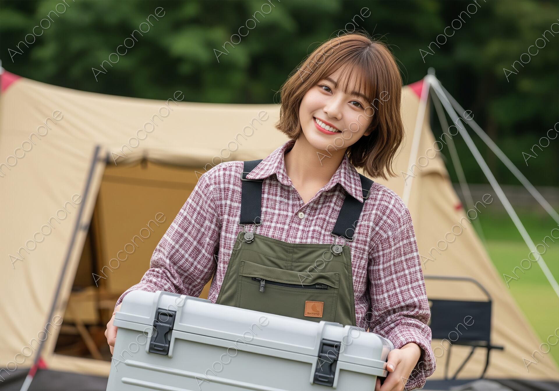 緑豊かなキャンプ場を背景に、楽しそうな笑顔を向ける日本人女性モデルのポートレートです。モデルは赤系のチェックシャツとカーキ色のオーバーオールを着用し、キャンプギアのコンテナボックスを抱えています。アウトドアファッションとアクティビティ、爽やかな笑顔が魅力的な一枚。キャンプ用品、旅行、ライフスタイル関連の広告やウェブ素材として最適です。
