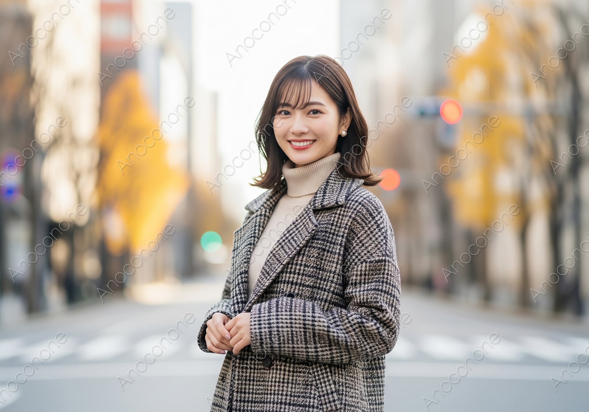 黄葉の並木がぼかしで入る都会の交差点で、チェック柄のウールコートとキャメル色のタートルネックを着用した女性のクローズアップです。内巻きのボブヘアと明るい笑顔が、都会的で洗練された秋の装いを魅力的に引き立てています。ファッション、ライフスタイル、ビジネスシーンなど、プロフェッショナルかつ親しみやすい印象を伝えたい際に最適な、高品質な画像素材です。