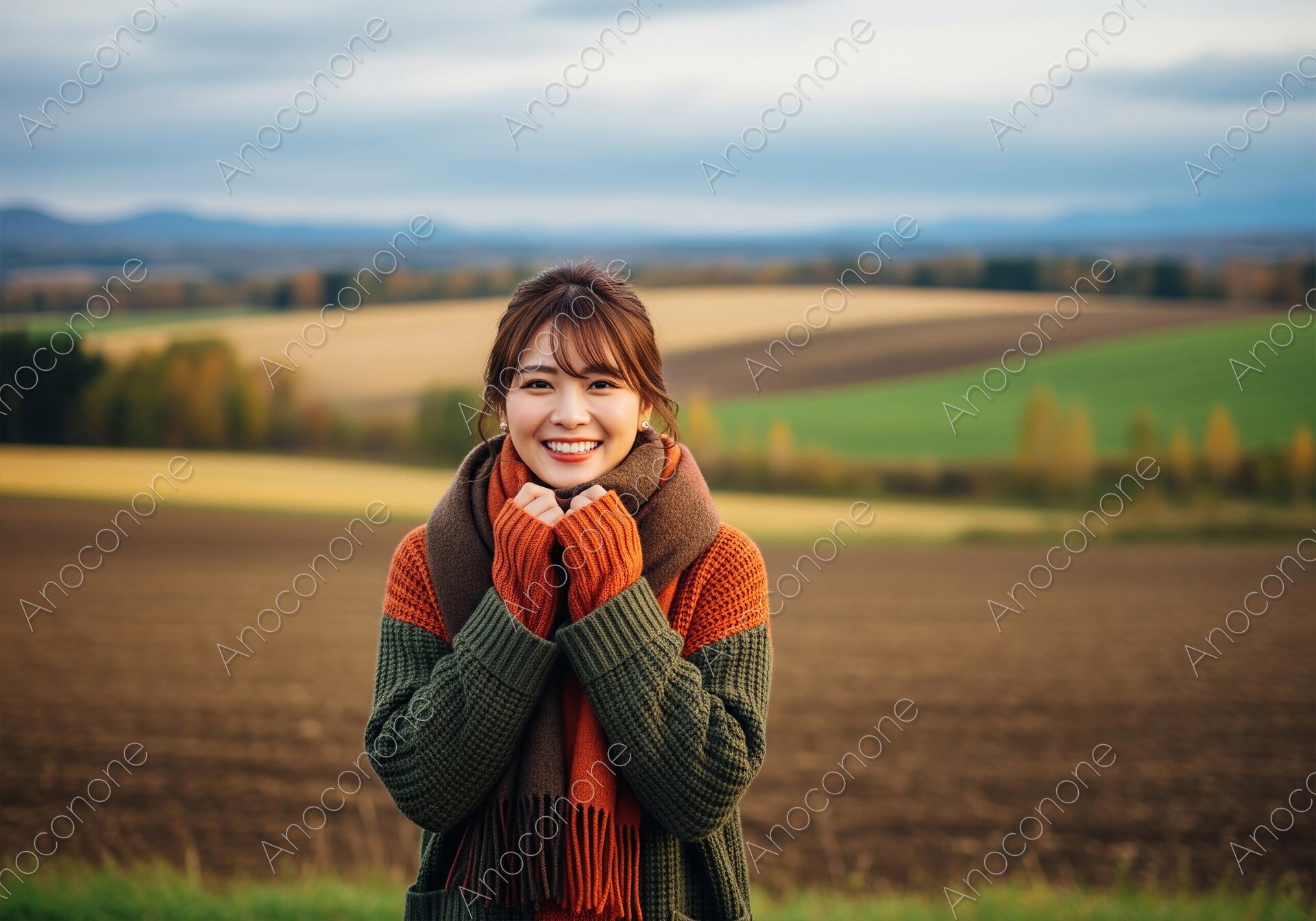 広大な畑と起伏のある秋の丘陵地を背景に、オレンジとグリーンを組み合わせたカラフルなニットと、ブラウンの厚手マフラーを着用した女性のクローズアップです。ふんわりとまとめたアップヘアと、マフラーに顔を寄せた満面の笑顔が、秋の旅の暖かさと心地よさを伝えます。旅行、アウトドア、ライフスタイル、または季節のファッション特集など、温もりと開放感を伝えるのに最適な画像素材です。