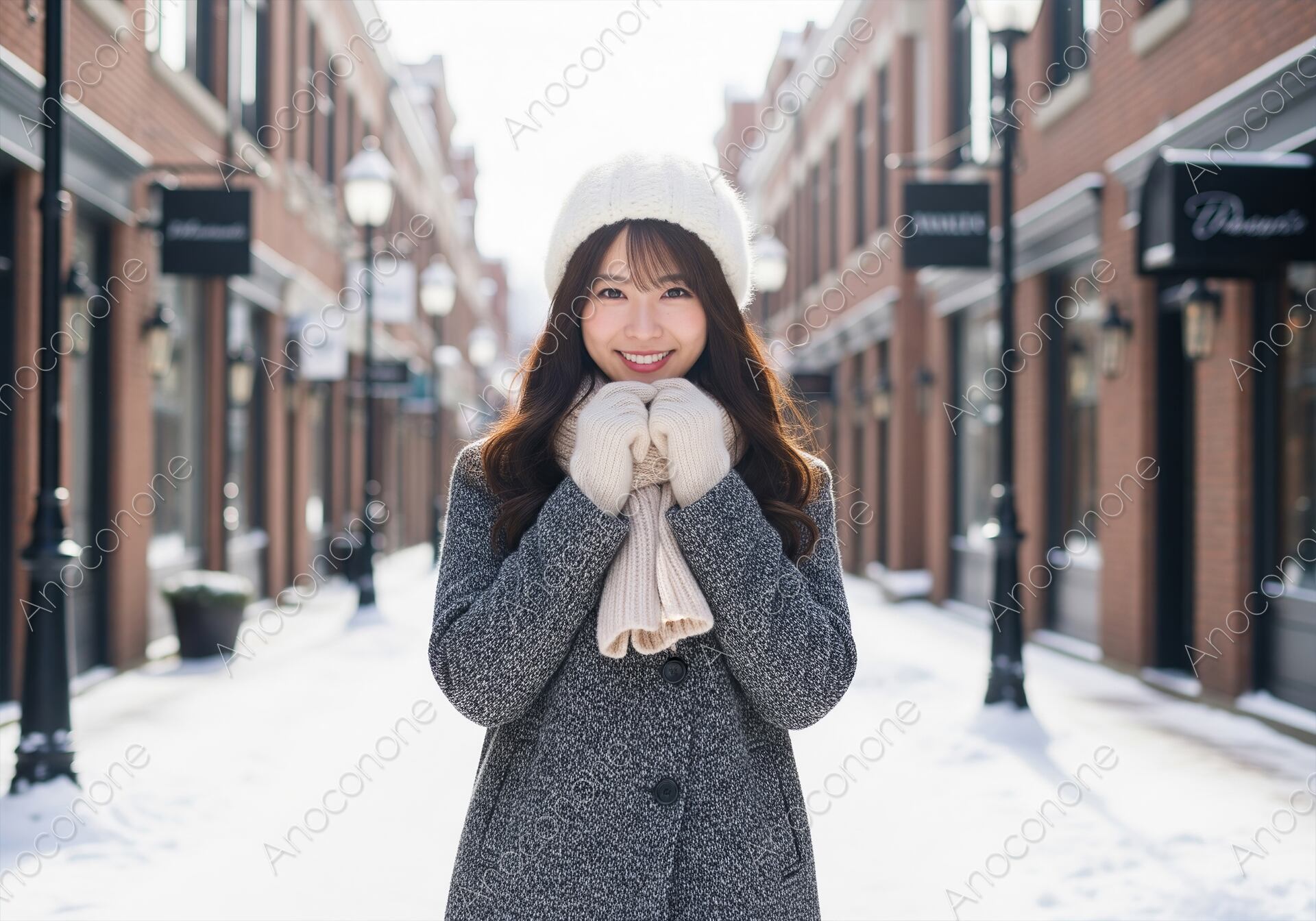 雪が積もったおしゃれなショッピングストリートで、白いニット帽とベージュのマフラーを身に着けた日本人女性モデルが、優しく微笑みかけているクローズアップポートレートです。グレーのツイードコートが冬の寒さの中にも温かさを演出。自然光がモデルを美しく照らし、明るい笑顔が魅力的な一枚。冬のファッション、ライフスタイル、旅行などのイメージ素材として幅広くご活用いただけます。