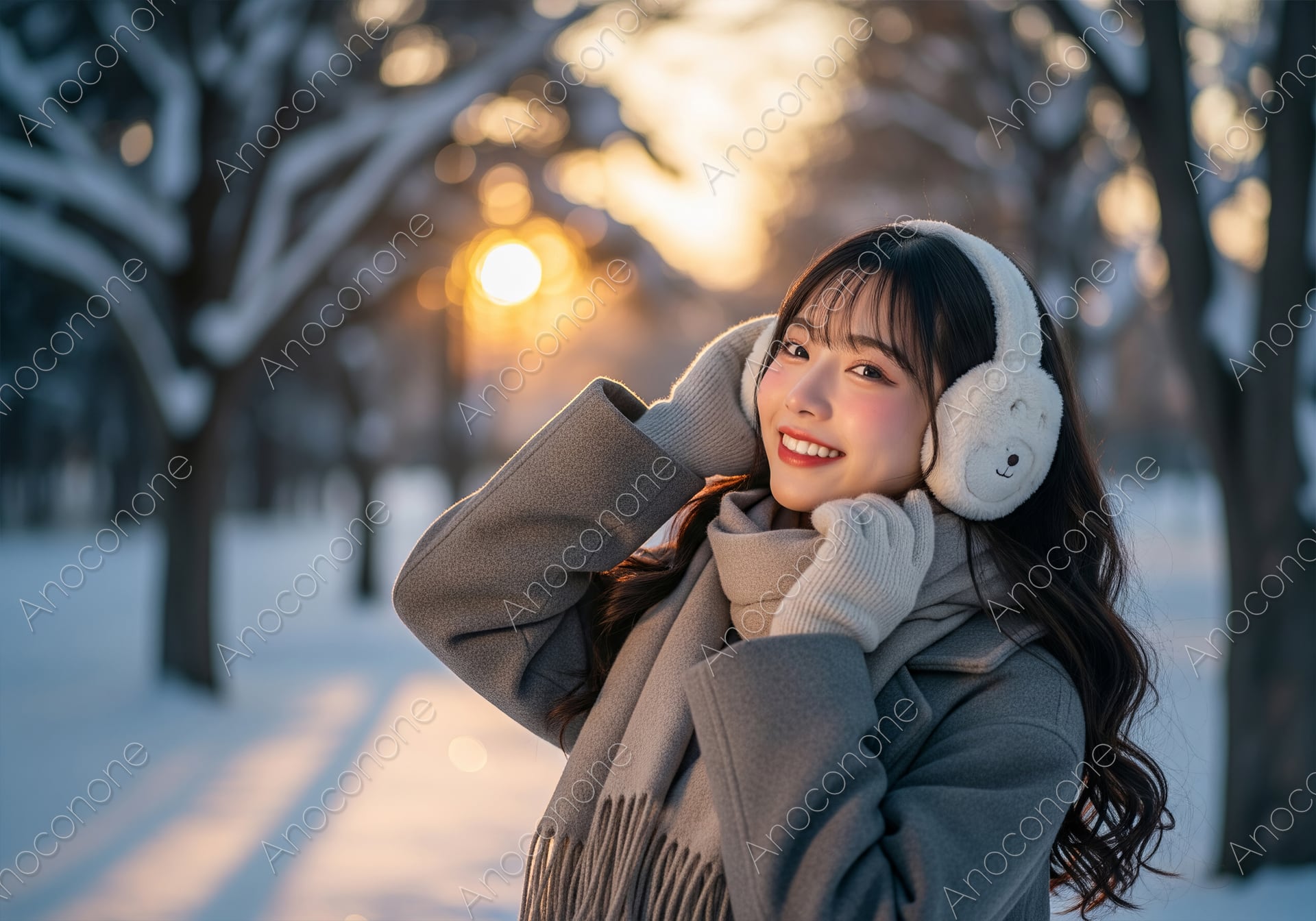 雪が積もる並木道で、夕陽に照らされながら微笑む日本人女性モデルのポートレートです。モデルは温かそうなグレーのコートとマフラー、そして可愛らしいクマのモチーフ付きのファーイヤーマフを着用。冬のファッションと寒さを楽しむ様子を捉えた、活き活きとした表情が魅力的な一枚です。冬のレジャーやアパレルの宣伝用素材としてご活用ください。