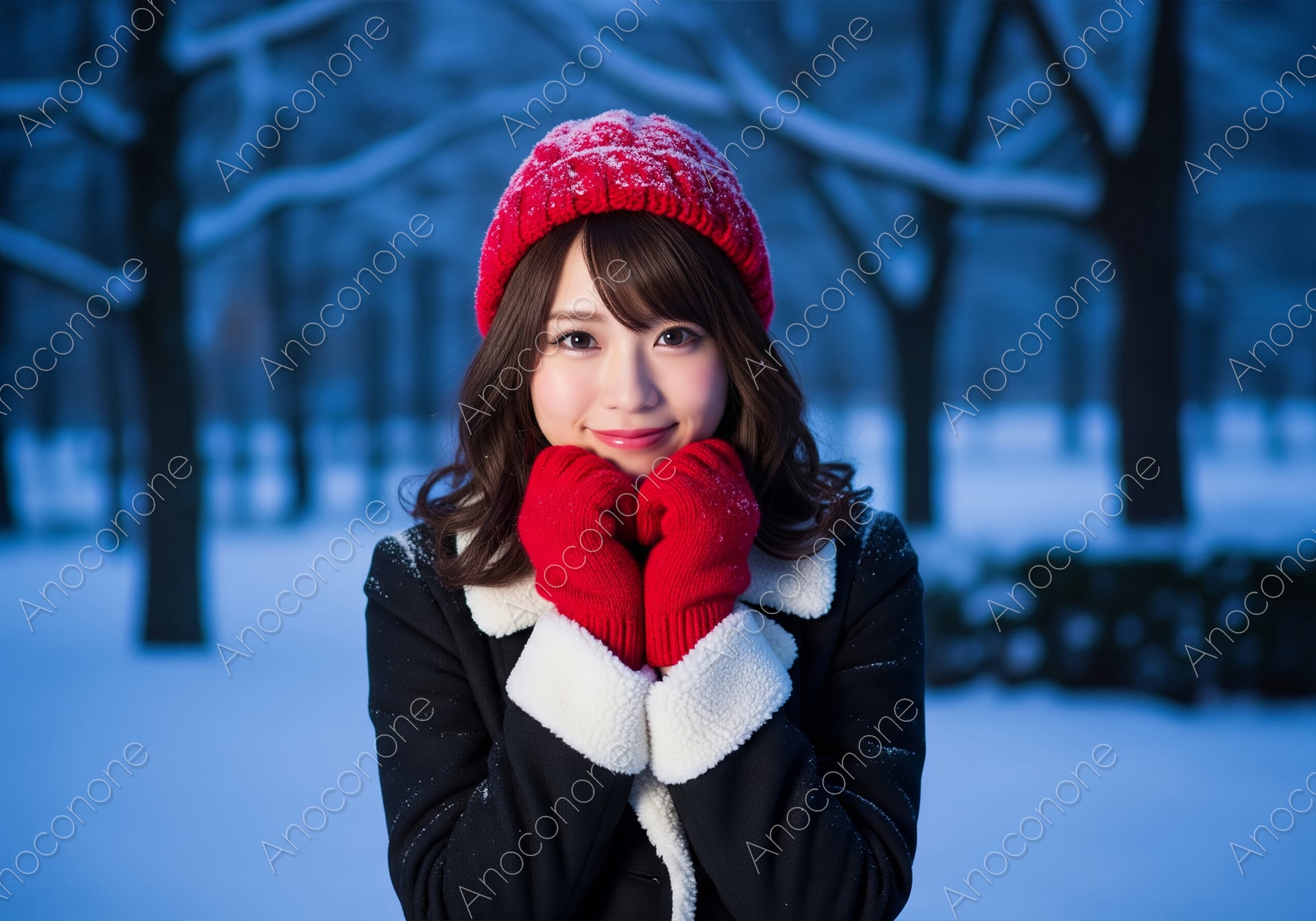 雪が積もる冬の公園で、暖かそうに微笑む日本人女性モデルのクローズアップポートレートです。黒のコートに、差し色となる鮮やかな赤いニット帽と手袋が目を引きます。愛らしい笑顔と、冷たい雪景色とのコントラストが印象的で、冬のファッションやクリスマスのイメージ、ウィンターシーズンのキャンペーン素材として、目を引く高画質素材です。