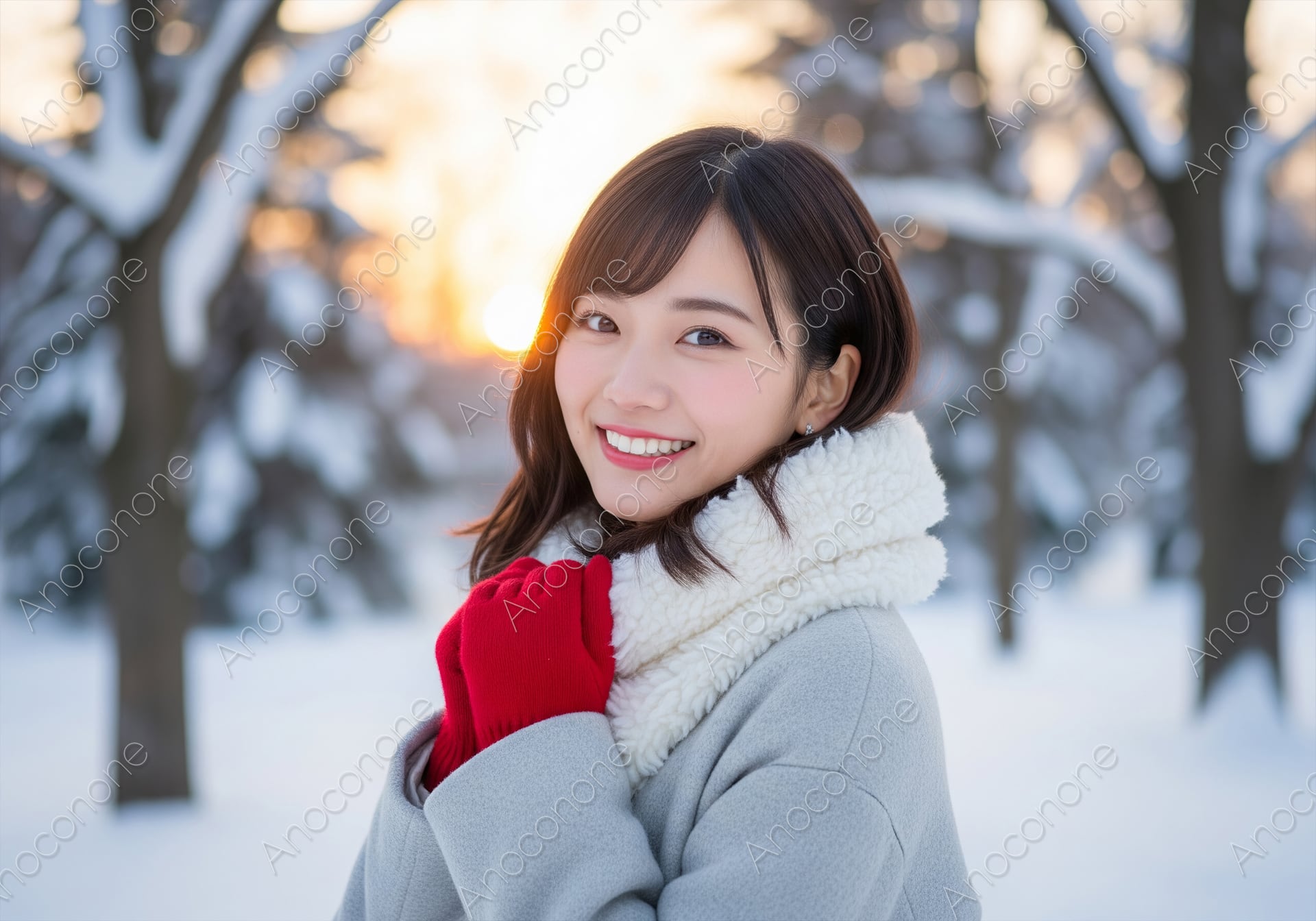 雪が積もった冬の並木道を背景に、夕陽を浴びて輝く日本人女性モデルのクローズアップポートレートです。モデルはグレーのコートに、白くふわふわのボアマフラーと鮮やかな赤の手袋を着用。明るい笑顔が寒さの中にも温もりを感じさせ、冬のファッション、アウトドア、ライフスタイル関連の広告やウェブ素材として魅力的な高画質画像です。