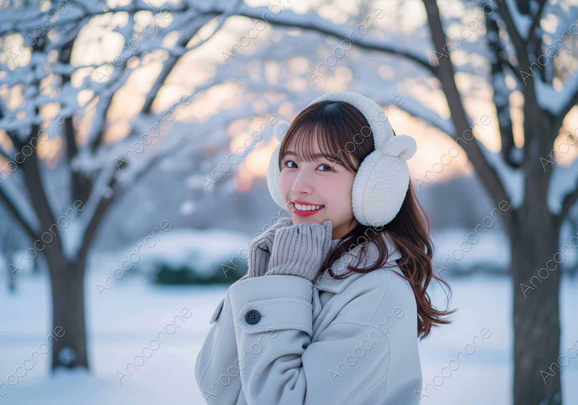 雪が積もるロマンチックな冬の公園で、可愛らしい白いファーイヤーマフとライトグレーのコートを着用した日本人女性モデルのポートレートです。暖かそうなグローブを付け、優しい笑顔でカメラに視線を送っています。寒色系の背景に、モデルの明るい表情と冬の防寒ファッションが映える、アパレルやライフスタイル系の素材に最適な一枚です。