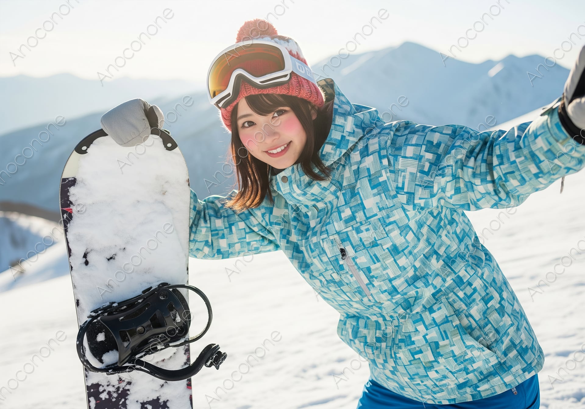 真っ白な雪山の頂上で、スノーボードを小脇に抱えて明るい笑顔を見せる女性のポートレートです。水色の柄が入ったスノボジャケットに、ピンクのニット帽とゴーグルを合わせたスタイルが、アクティブで楽しげな雰囲気を伝えます。前髪を揃えたヘアスタイルがキュートな印象です。ウィンタースポーツ、ファッション、冬のレジャーに関する雑誌、ウェブ広告、SNSなどのビジュアルコンテンツとして、楽しさや爽快感を表現したいターゲットに最適です。