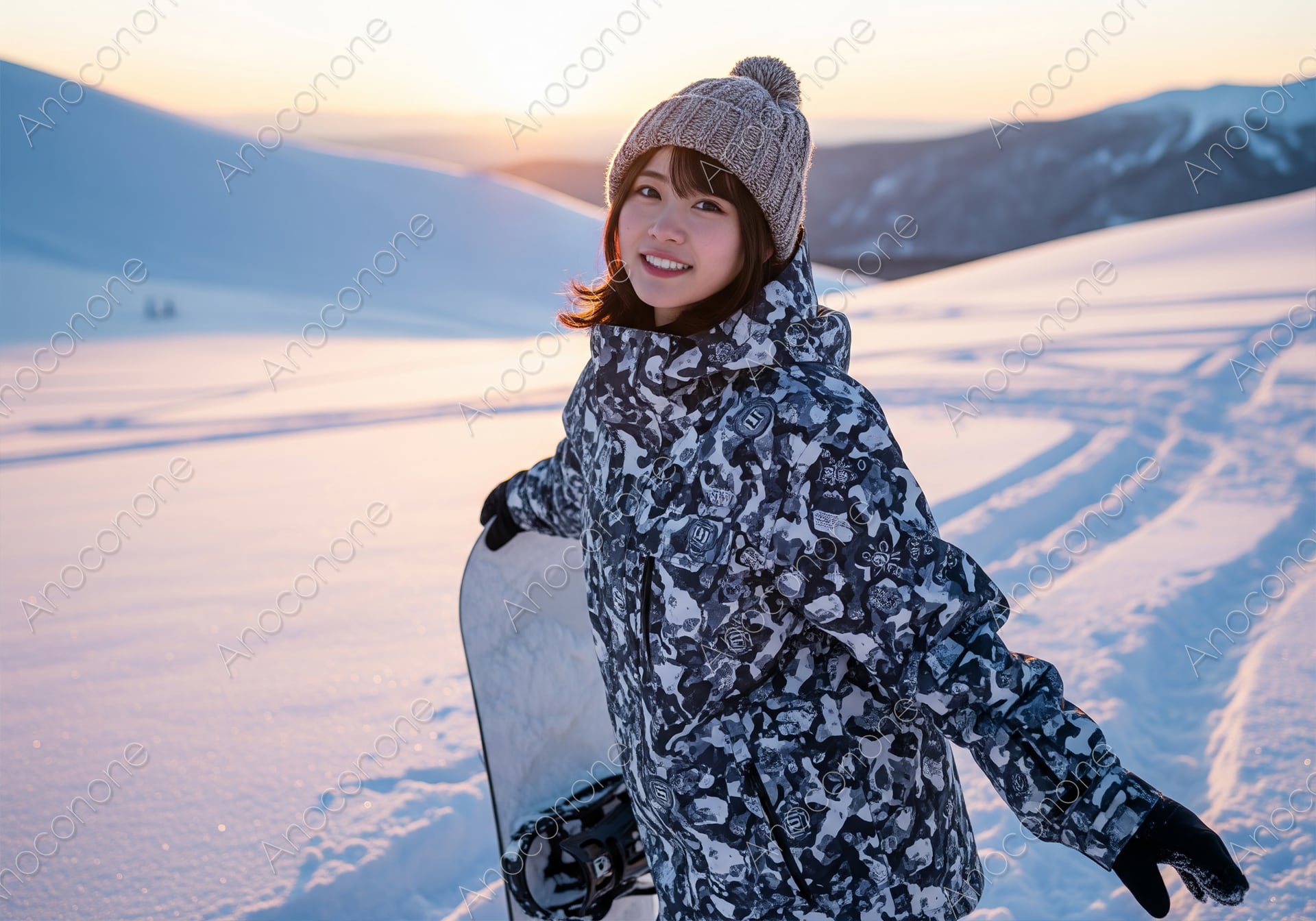夕焼けに染まり始めた雪山を背景に、スノーボードを抱えて振り返り、優しく微笑む女性のポートレートです。モノトーンの迷彩柄スノーボードウェアに、グレーのニット帽を合わせた、スタイリッシュなファッションが魅力的です。前髪を揃えた茶髪のミディアムヘアが、可愛らしい印象を与えます。ウィンタースポーツ、アパレル、旅行関連のウェブサイトや広告で、ターゲットにアクティブなライフスタイルや、冬の美しい景色を訴求するイメージとして最適です。