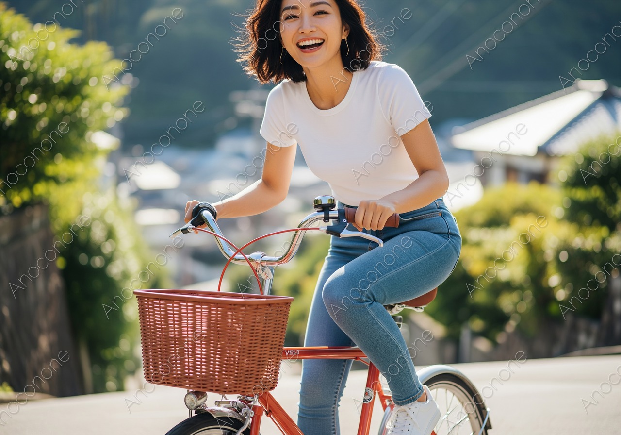 新緑が眩しい街中で、かご付きの自転車に乗り、心から楽しそうに笑う女性のポートレートです。シンプルな白いTシャツに、明るい色のスキニーデニムを合わせた、清潔感あふれるカジュアルスタイルが魅力的です。肩のラインで軽やかに跳ねるショートボブのヘアスタイルが、快活な雰囲気を演出しています。日常、健康、環境、地域生活をテーマとした広告やウェブコンテンツで、ターゲットに親しみやすさや明るいイメージを伝えるのに最適なビジュアルです。