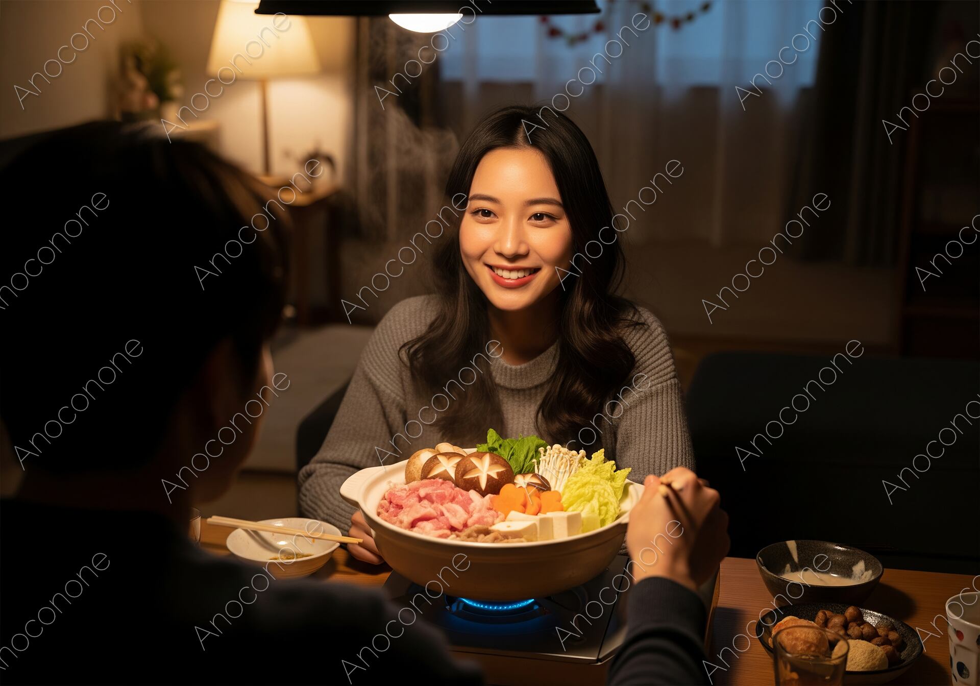 夜の落ち着いた室内で、ロングヘアの女性が夫と土鍋を囲み、温かい食事のひとときを楽しむ光景です。グレーのクルーネックニットを着用した女性の優しい笑顔と、湯気が立ち上る鍋が、親密で心地よい雰囲気を作り出しています。冬の夜の食卓、特別な日のディナー、または暖かさや安心感をテーマにした広告や、食材・調理器具のウェブ素材として非常に魅力的で訴求力の高い一枚です。