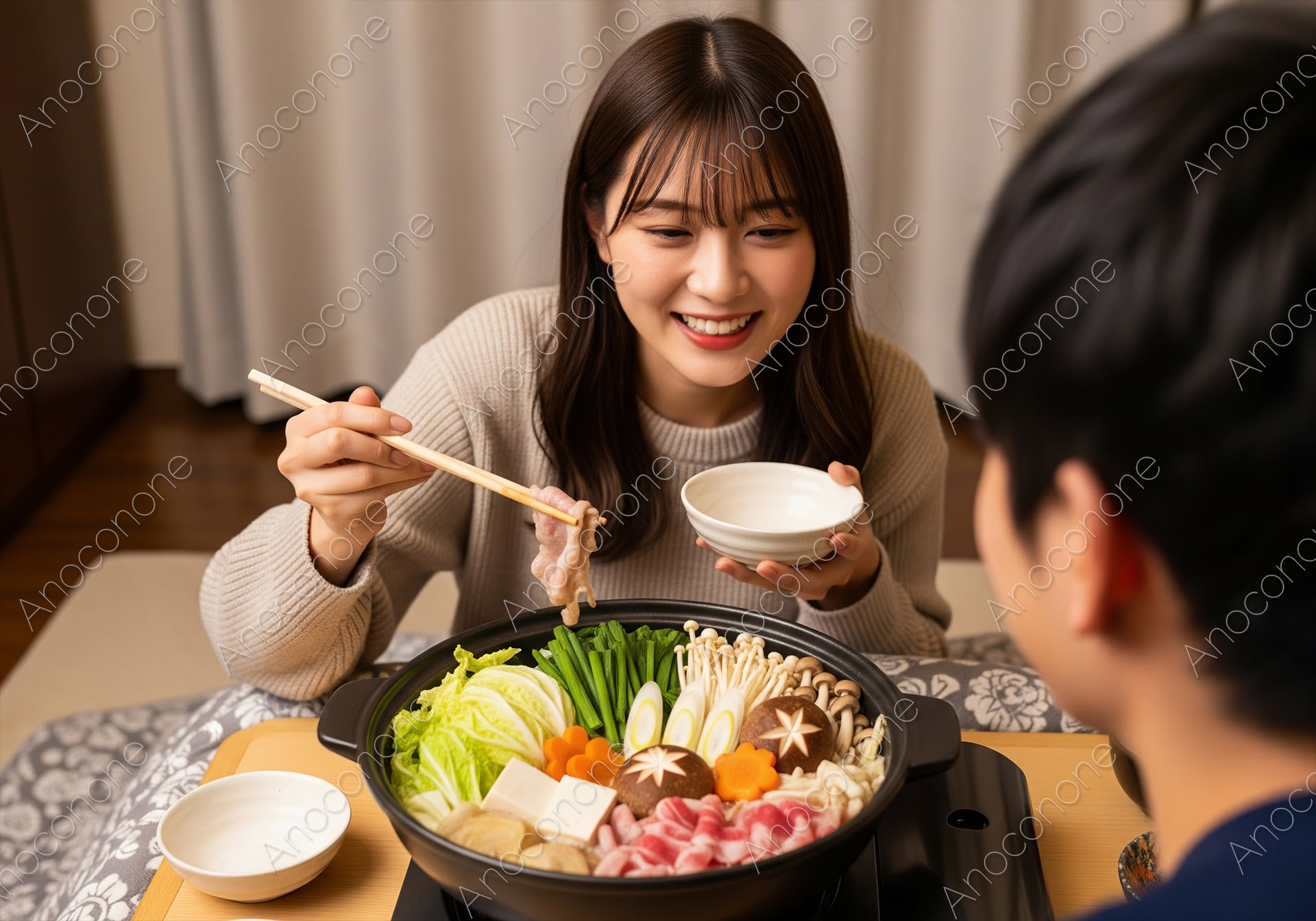 冬の風物詩であるこたつを囲み、温かい鍋料理を楽しむ夫婦の親密な瞬間です。ベージュのクルーネックニットを着たミディアムヘアの女性が、笑顔で夫と向かい合い、箸で具材を取り分けている様子は、心から楽しんでいる様子が伝わります。日本の家庭的な温かさや、冬の心地よい食卓をテーマにした広告、ウェブサイト、食品関連のコンテンツに最適な、明るく幸せなイメージです。