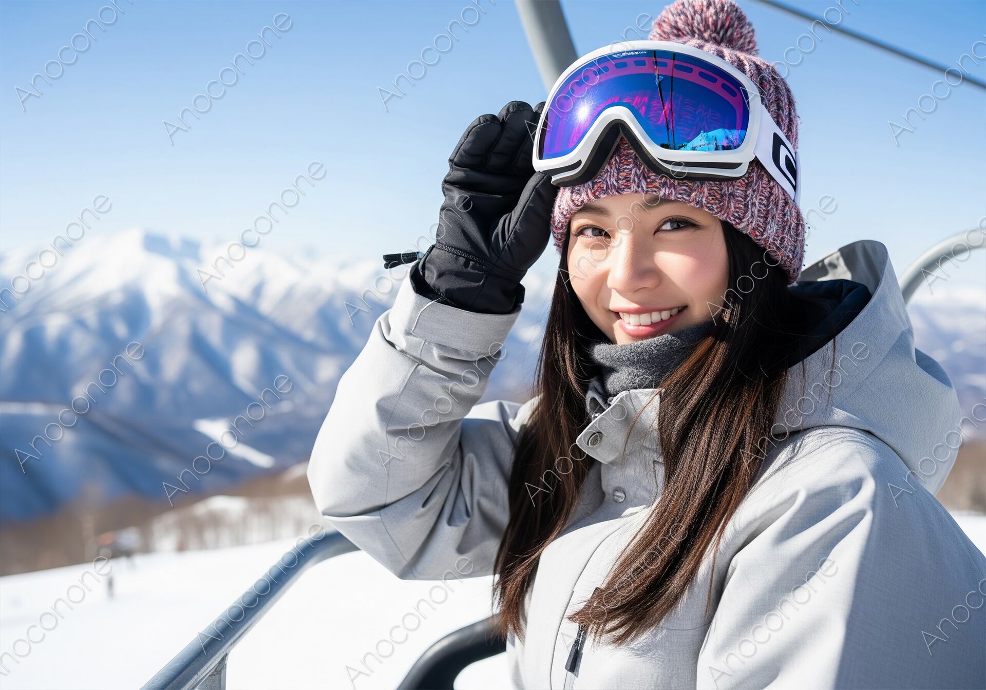 快晴の雪山でスキーリフトに乗りながら、カメラに明るい笑顔を向ける女性のポートレートです。白とグレーを基調としたシンプルなウェアに、カラフルなポンポン付きニット帽と大きなミラーゴーグルを合わせた、スタイリッシュなウィンタースポーツスタイルです。長い黒髪がウェアからのぞき、健康的な魅力を引き立てています。ウィンタースポーツ、冬のレジャー、アパレル関連のウェブサイトや広告素材として、ターゲットに爽快感や楽しさ、アクティブな冬のライフスタイルを伝えるのに最適です。