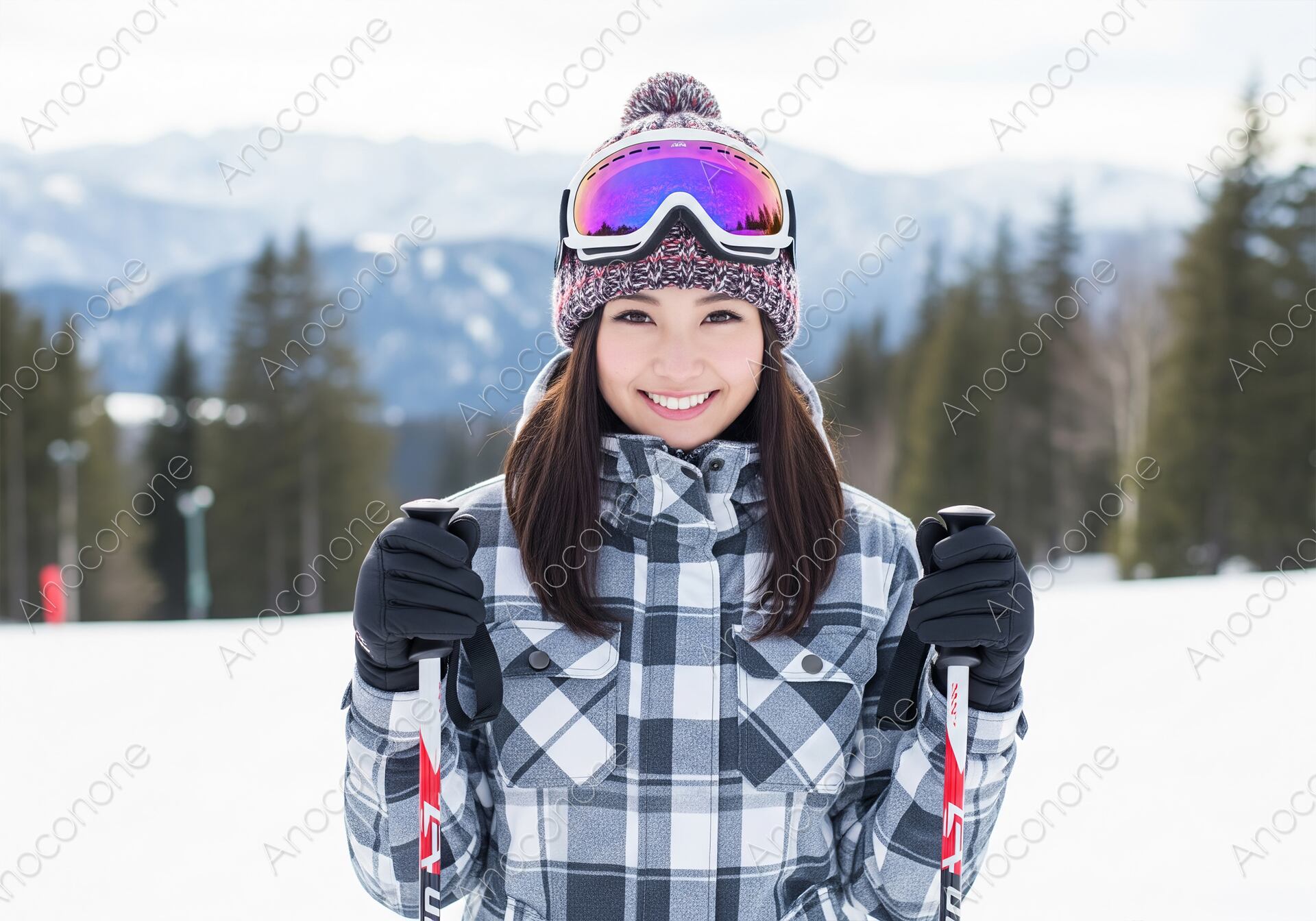 真っ白な雪山のゲレンデで、スキーのストックを両手に持ち、爽やかな笑顔を見せる女性のポートレートです。白黒のカジュアルなチェック柄ウェアに、カラフルなポンポン付きニット帽とミラーゴーグルを着用し、おしゃれでアクティブなスタイルです。長い黒髪がウェアからのぞき、健康的な魅力を引き立てています。ウィンタースポーツ、アパレル、旅行関連のウェブサイトや広告素材として、ターゲットに楽しさやファッション性を伝え、冬のレジャーへの意欲を高めるビジュアルとして最適です。