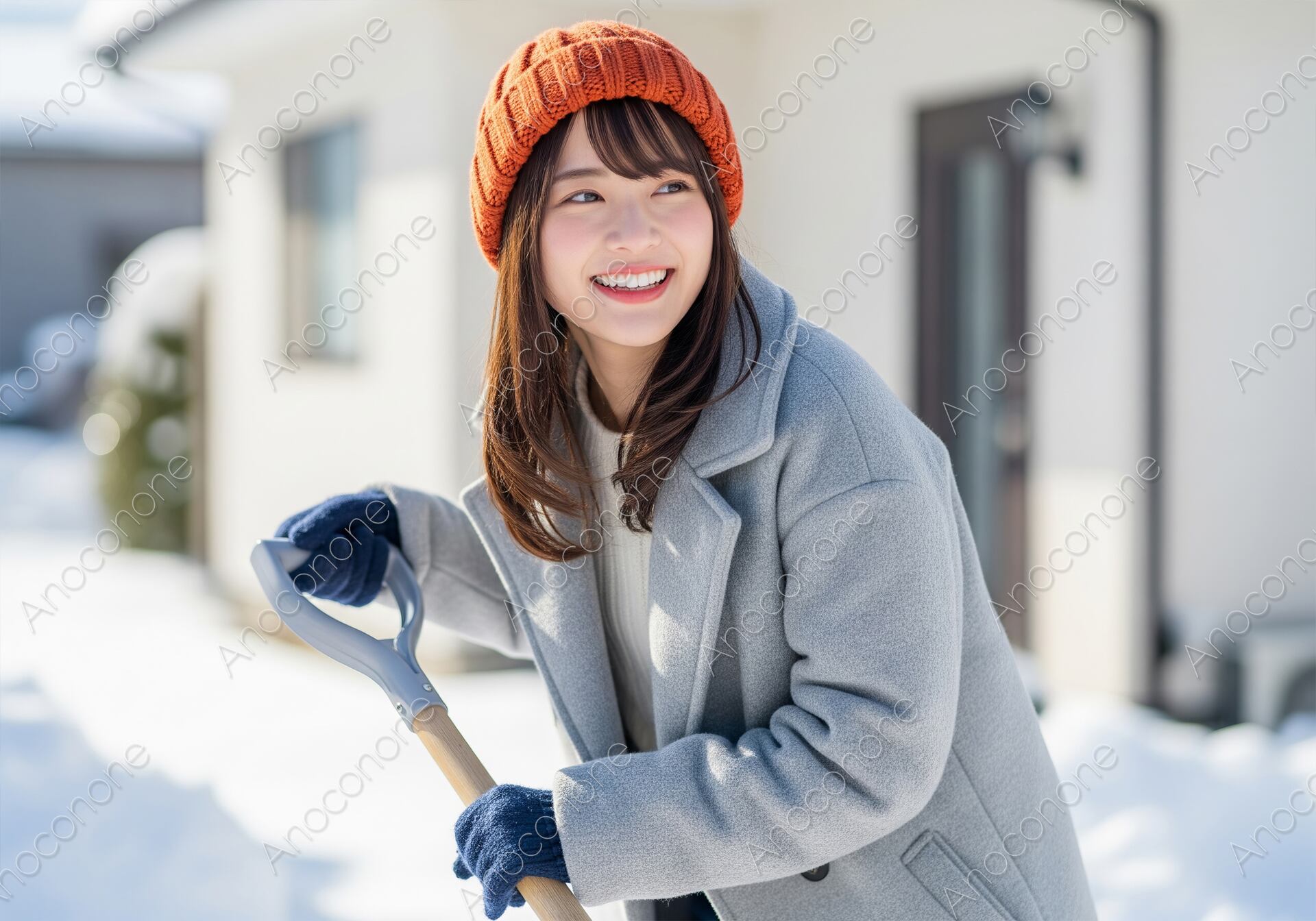 自宅の雪が積もった庭先で、明るい日差しの中、雪かき作業を行う女性のポートレートです。淡い水色のチェスターコートのような冬物コートに、鮮やかなオレンジ色のニット帽、紺色の手袋を合わせた、おしゃれな防寒スタイルが魅力的です。前髪を揃えた茶髪のミディアムヘアが親しみやすい印象を与えています。冬の生活、住宅、防寒着、生活用品に関する広告・ウェブサイト・雑誌などで、ターゲットに活動的で明るい冬の日常を伝えるビジュアルとして最適です。