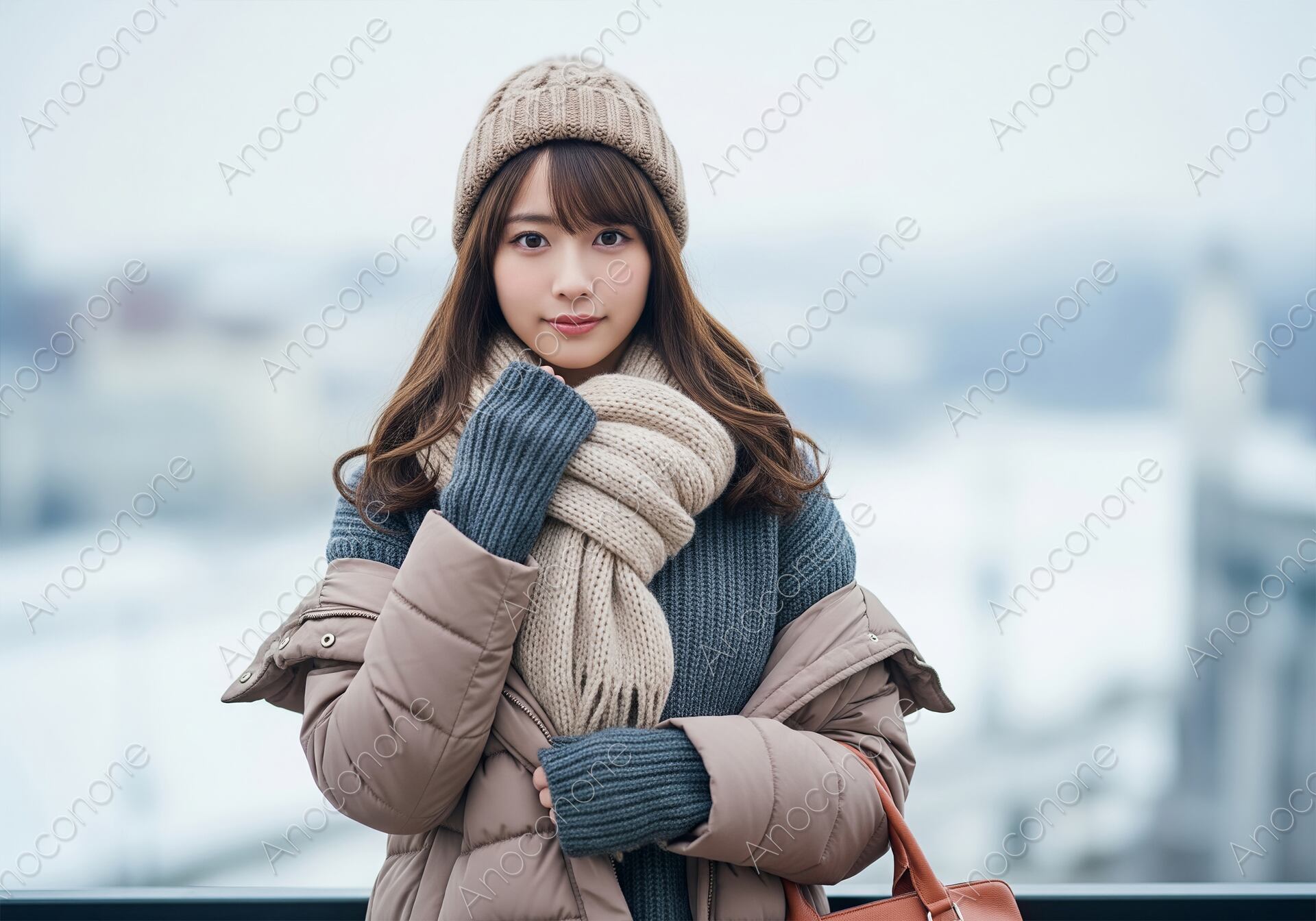 ベージュのニット帽とマフラー、モカ色のダウンジャケットを着用した女性の写真素材です。柔らかなベージュのニット帽とマフラーの組み合わせが、穏やかで洗練された印象を与えます。モカ色のダウンジャケットが、冬の寒さから守る頼もしさを感じさせながら、彼女の温かみのある笑顔が心を打ちます。このビジュアルは、ファッション、ライフスタイル、冬のスタイル提案に関する広告・ウェブサイト・雑誌などで、ターゲットに温もりや親しみやすさを訴求するのに最適な素材です。