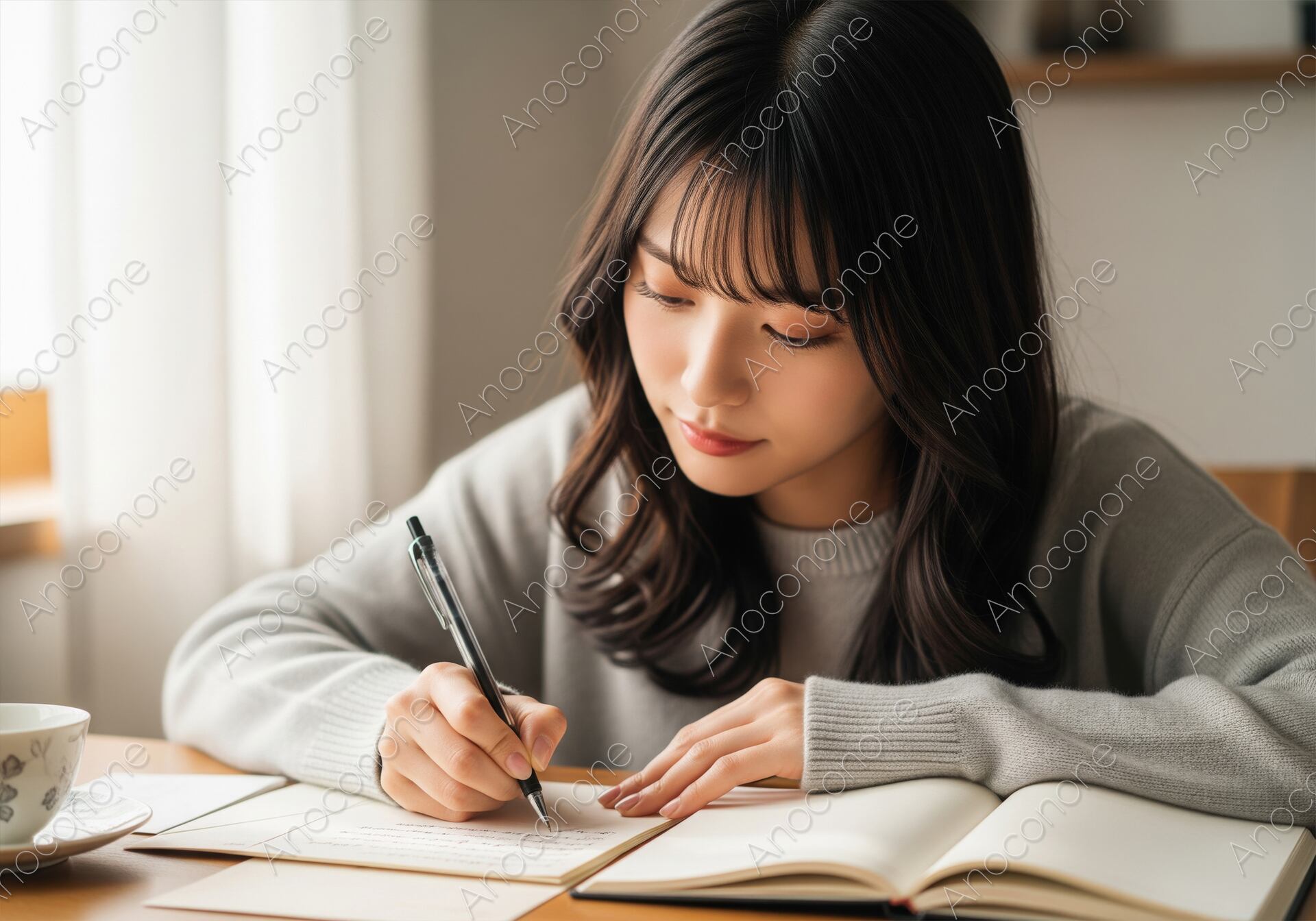 画像素材:穏やかな自然光が差し込むリビングで、真剣な表情で手紙を書く若い女性のアップショットです。グレーのニットを着用し、机の上にはノートとコーヒーカップが見えます。集中して文字を綴る様子が、静かで知的な日常の一コマを表現しています。
