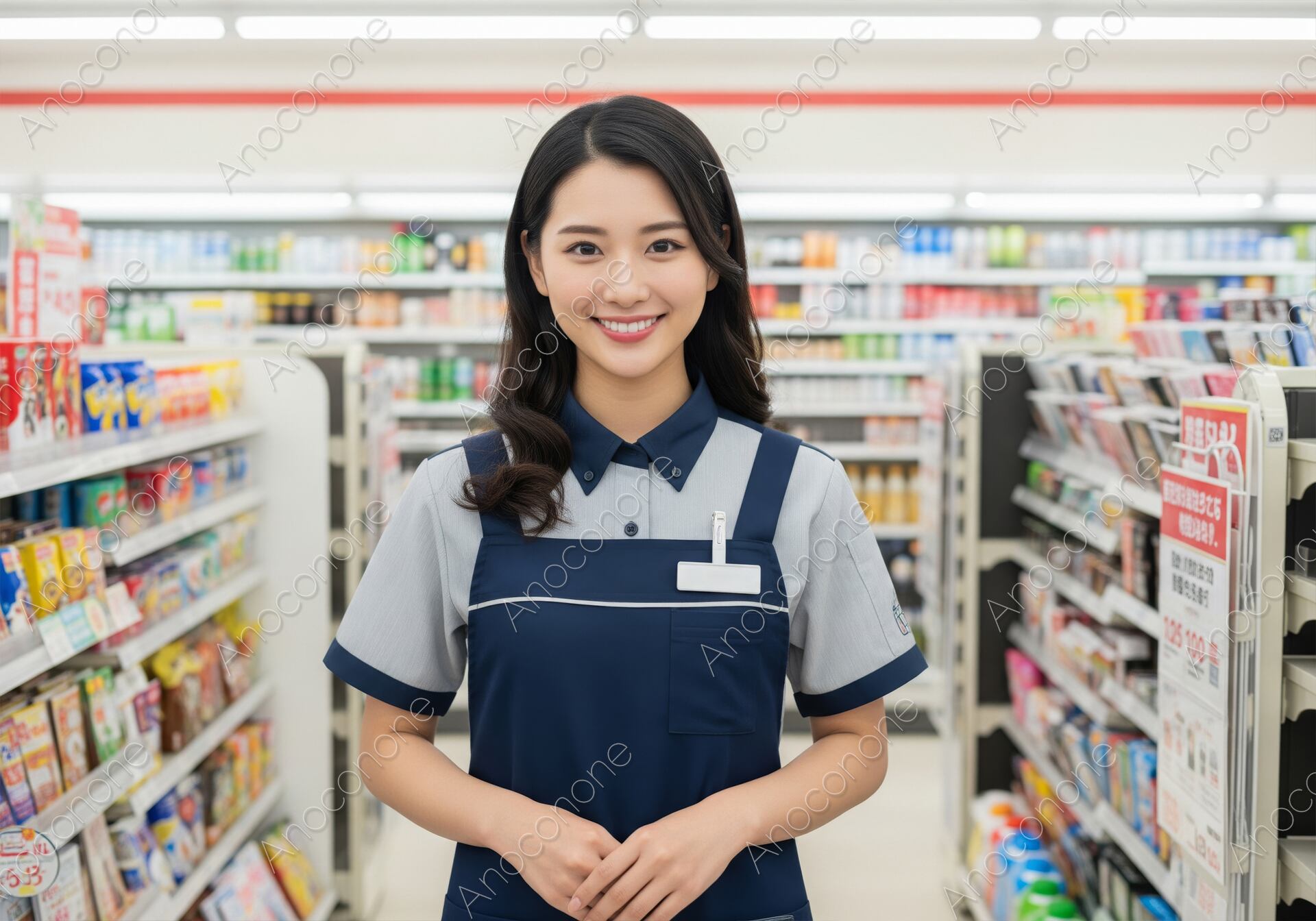 画像素材:コンビニエンスストアの明るい通路に立ち、満面の笑顔でカメラを見つめる女性のバストアップショットです。ネイビーのエプロンと爽やかなポロシャツの制服を着用し、親切でフレンドリーな店舗スタッフのイメージを表現しています。背景には商品棚が並び、活気ある小売店の雰囲気が伝わります。