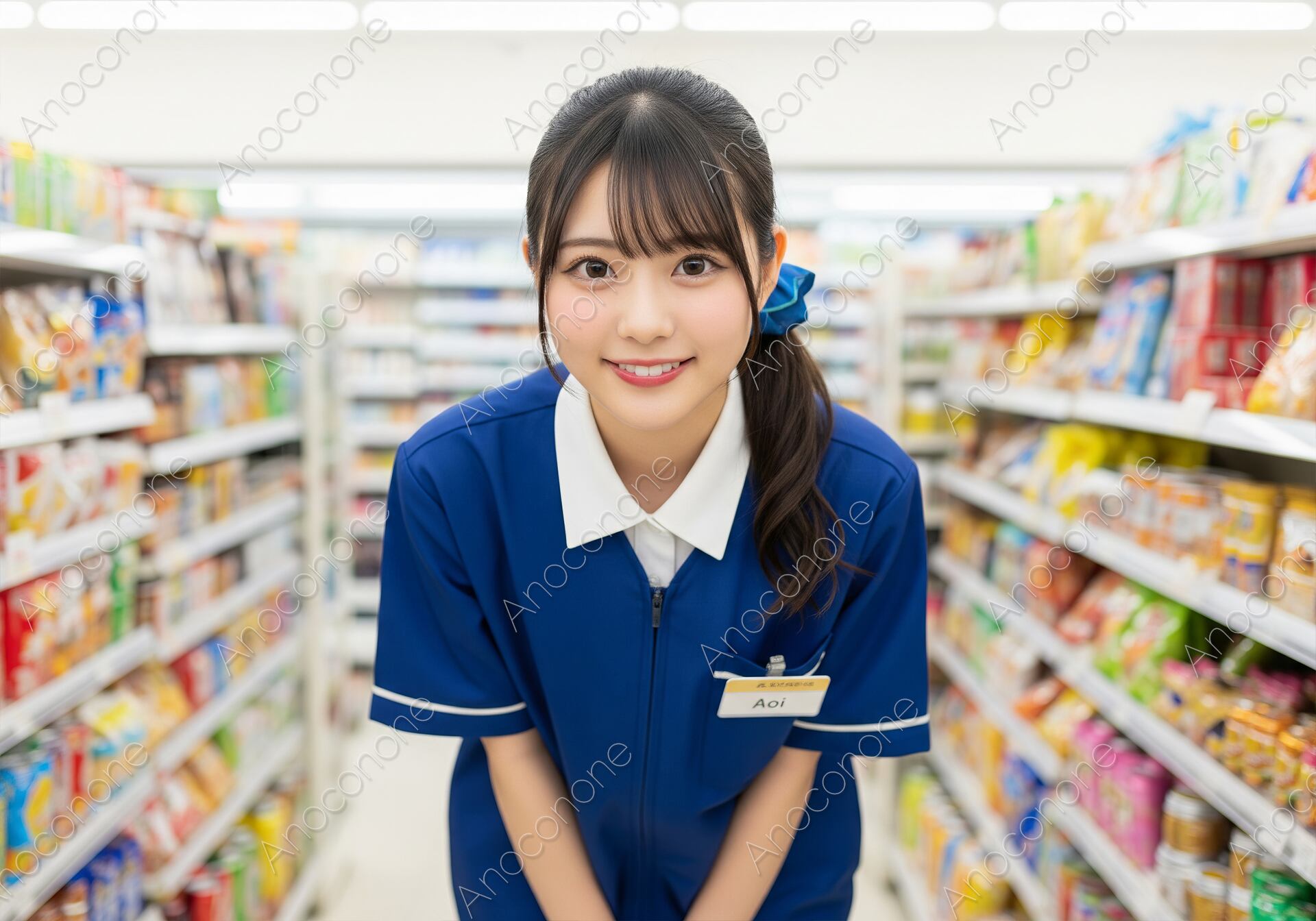 画像素材:コンビニエンスストアの明るい商品通路で、少し前かがみになってカメラに爽やかな笑顔を見せる女性店員のバストアップショットです。鮮やかな青いポロシャツの制服を着用し、ポニーテールにまとめた髪に青いリボンがアクセントになっています。親しみやすく、元気で可愛らしいスタッフのイメージを表現しています。