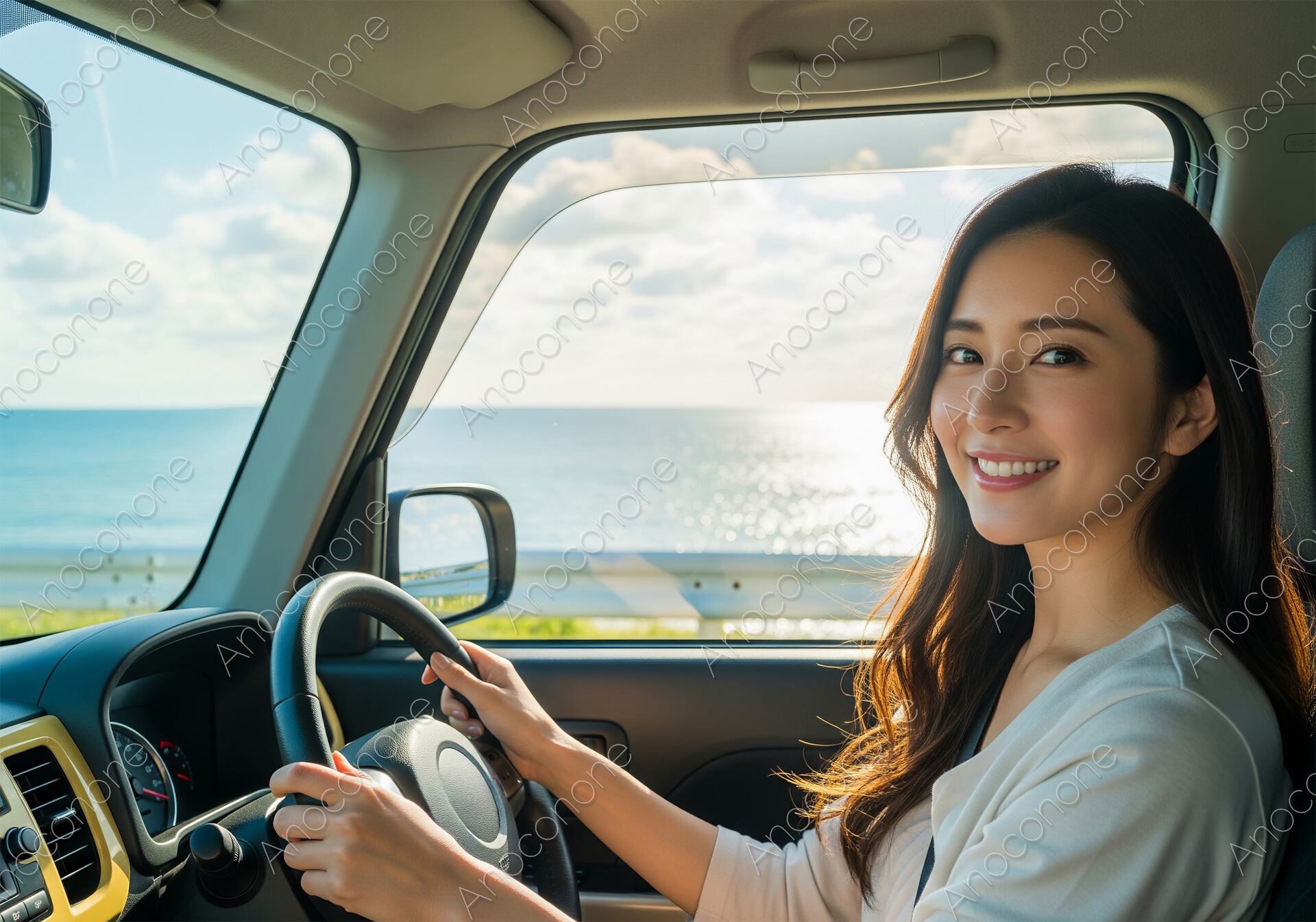 画像素材:晴れた日の海辺の道をドライブする様子を車内から捉えた画像です。明るい陽光が差し込む中で、運転席に座る女性がハンドルを握り、カメラに向かって爽やかな笑顔を見せています。窓の外には青い海が広がり、波間がキラキラと輝いています。この画像は、休日のレジャーや旅行、カーライフの楽しさを表現するのに最適です。