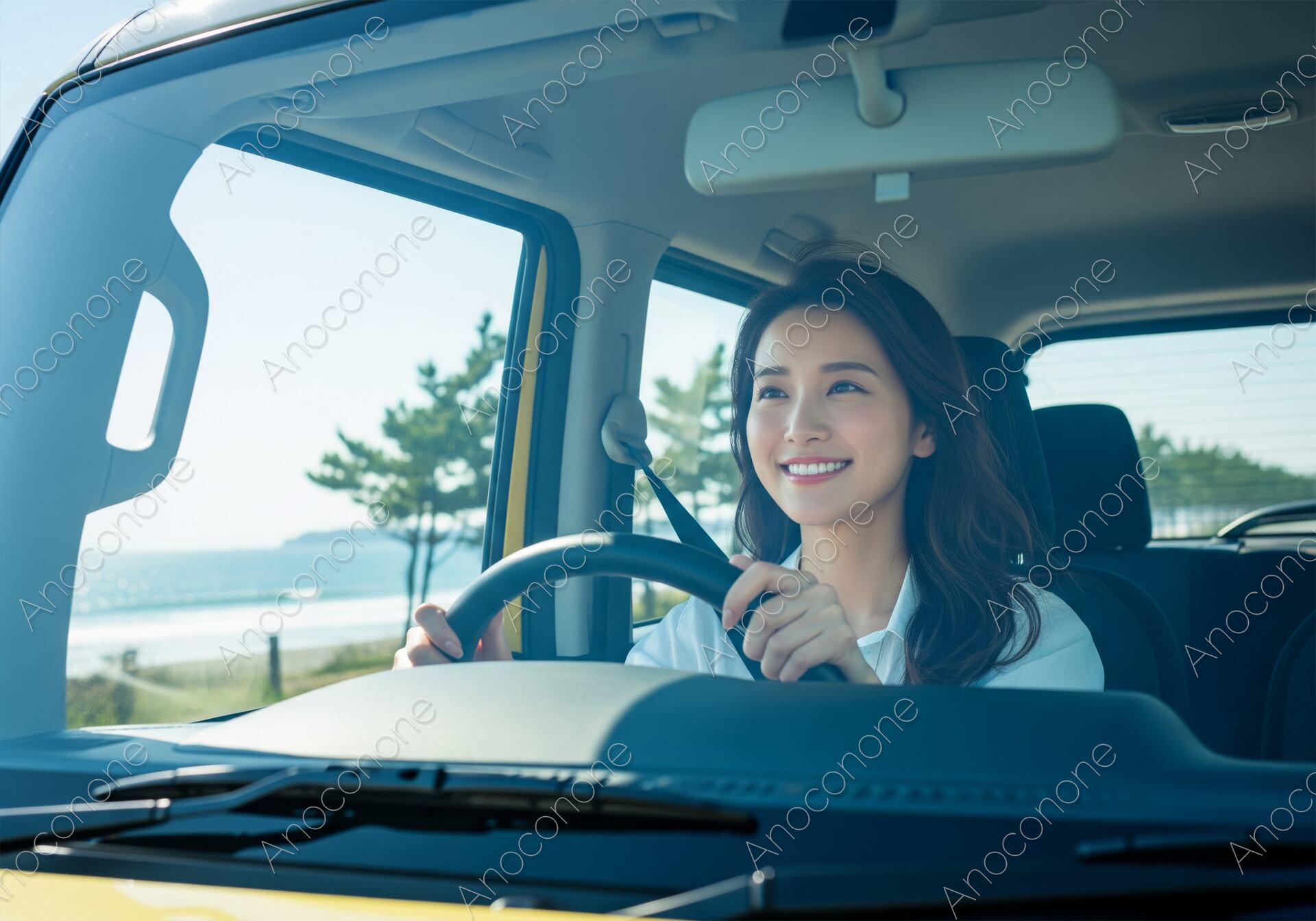 画像素材:海岸線の道路を運転する女性を、車内からフロントガラス越しに捉えた画像です。明るい日差しが差し込む中、女性はハンドルを握り、遠くの景色を見ながら穏やかで自信に満ちた笑顔を浮かべています。窓の外には青い海と緑の木々が見え、快適で自由なドライブの雰囲気が伝わってきます。カーライフの楽しさや休日の移動のイメージに最適です。