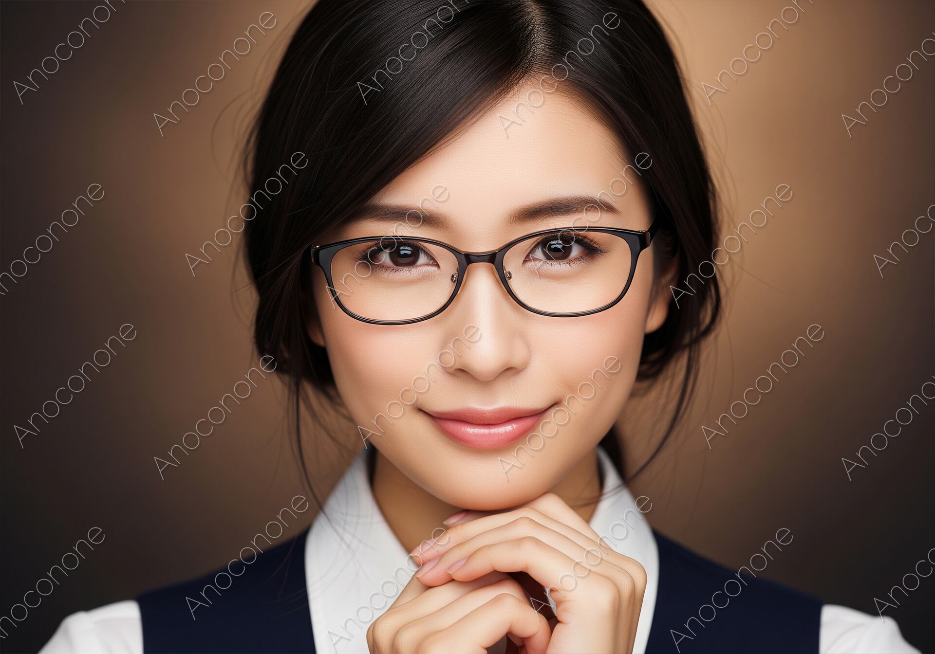 画像素材:黒縁のメガネをかけ、穏やかに微笑む女性のバストアップのポートレートです。白いシャツとネイビーのベストを着用し、両手を顎の下で重ねるポーズは、知性と落ち着き、そして誠実な印象を与えます。背景は暖色系のグラデーションで、プロフェッショナルな雰囲気を際立たせています。企業のイメージやビジネス関連のコンテンツに最適な素材です。