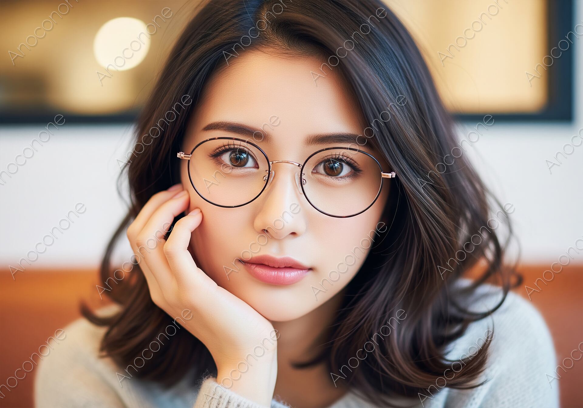 画像素材:丸いフレームのメガネをかけた女性のクローズアップポートレートです。女性は、頬にそっと手を添え、カメラに向かって真剣で穏やかな視線を送っています。背景は暖色系のぼかしで、屋内やカフェのようなリラックスした雰囲気を醸し出しています。知的ながらも親しみやすいイメージや、ファッション、ライフスタイルのコンテンツに最適な素材です。