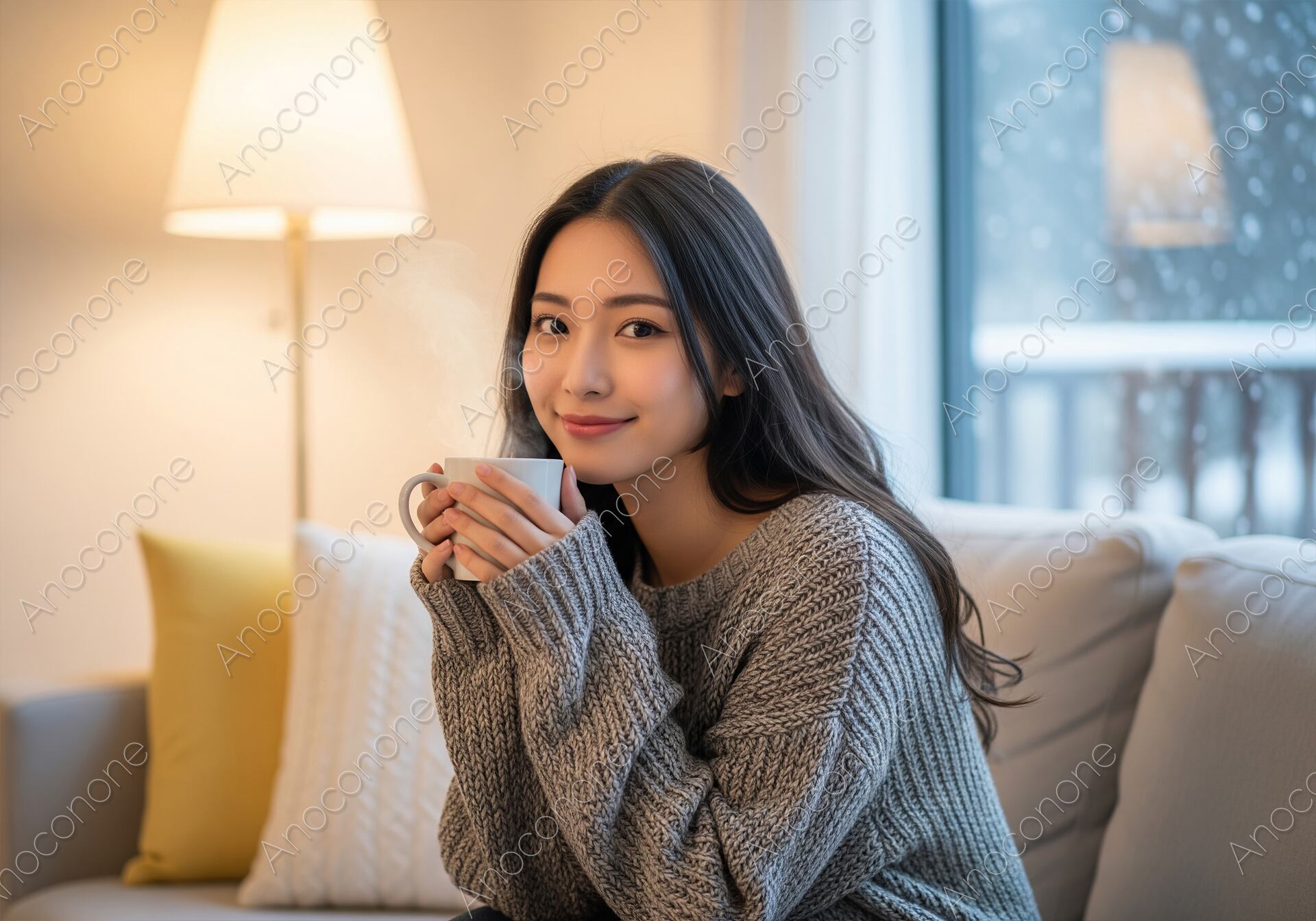 画像素材:雪が降る寒い冬の日に、自宅のソファで温かい飲み物を飲みながらリラックスしている女性の画像です。ざっくりとしたグレーのニットセーターを着た女性が、両手でマグカップを包み込み、カメラに向かって穏やかな笑顔を見せています。窓の外には雪景色が広がり、暖炉のようなランプの光が心地よい、暖かな屋内での生活の様子を表現しています。