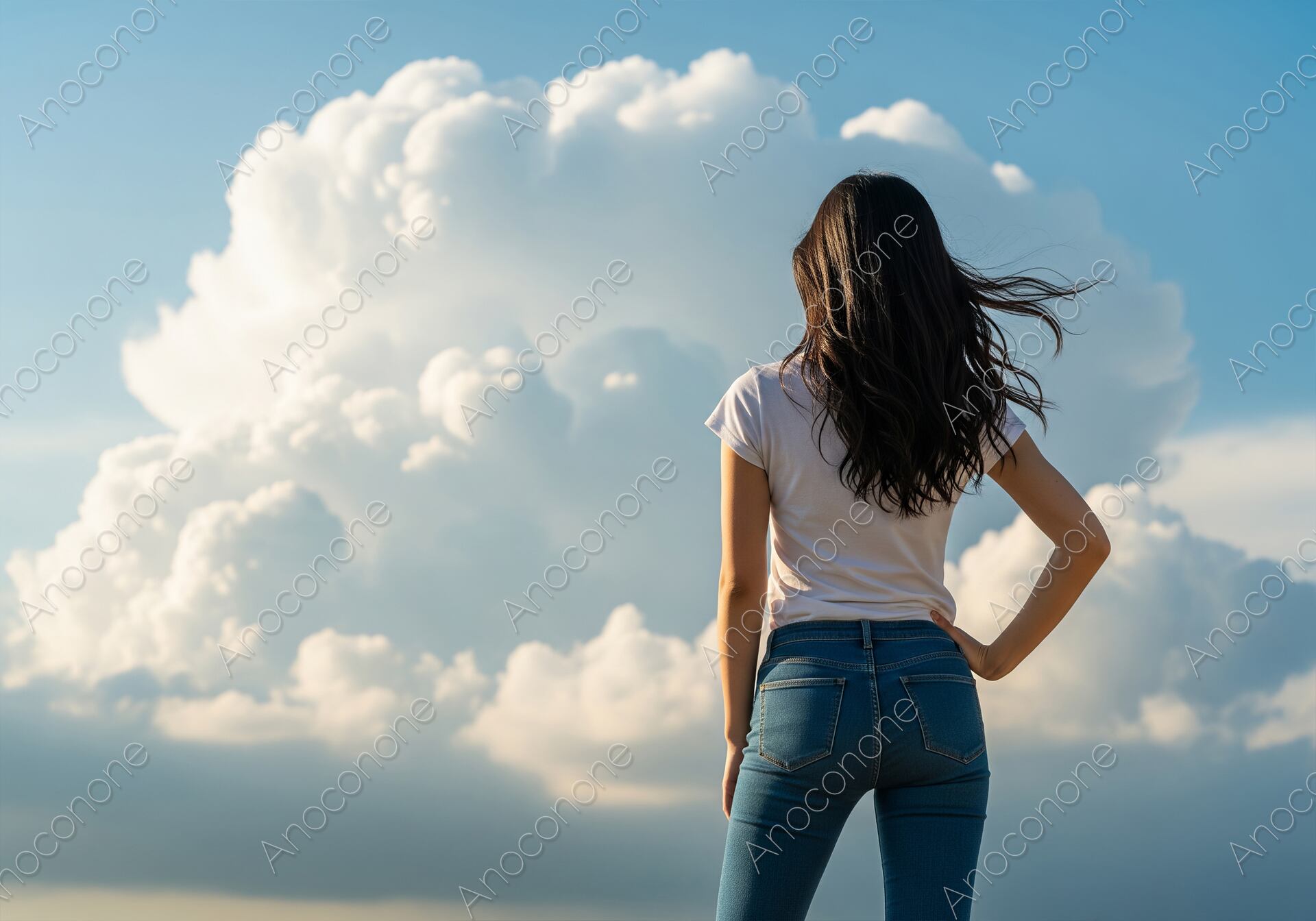 画像素材:晴れた日の青い空と雄大な積乱雲(入道雲)を背景に、丘や高台に立っている女性の後ろ姿を捉えた画像です。女性は白いTシャツとスキニーフィットのジーンズを着用し、腰に手を当てて、遠くの景色を見つめています。風になびく黒髪と、大きく広がる空が、自由や希望、目標に向かって進む強い意思といったポジティブなメッセージを伝えます。