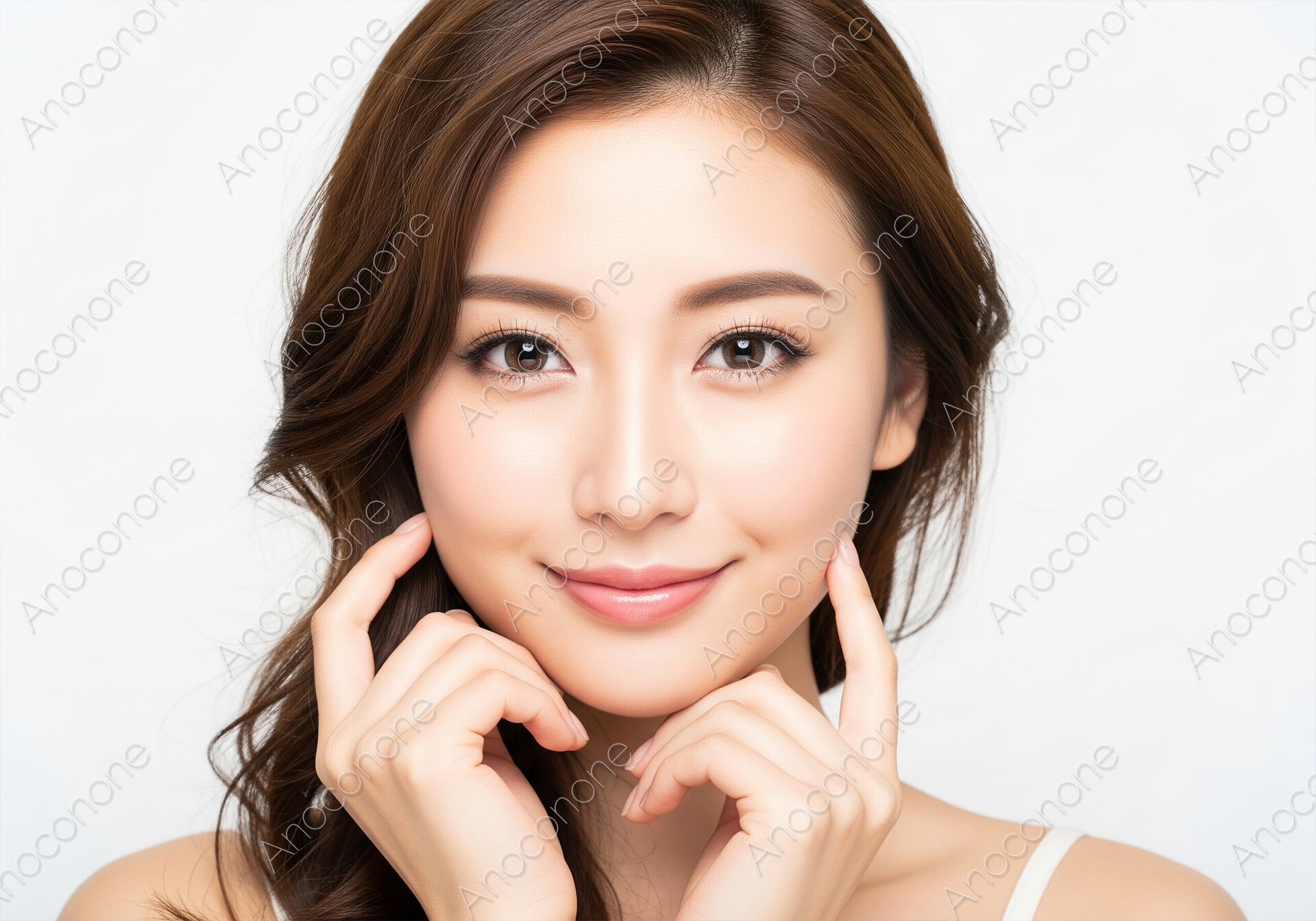 画像素材:両手の指先で頬に優しく触れながら、穏やかに微笑む女性のクローズアップポートレートです。透明感のある美しい肌と、内側から輝くような表情が印象的です。白い背景で撮影されており、肌の美しさや清潔感が際立っています。美容、スキンケア製品、化粧品、健康関連の広告やウェブサイトのキービジュアルとして最適な高画質素材です。